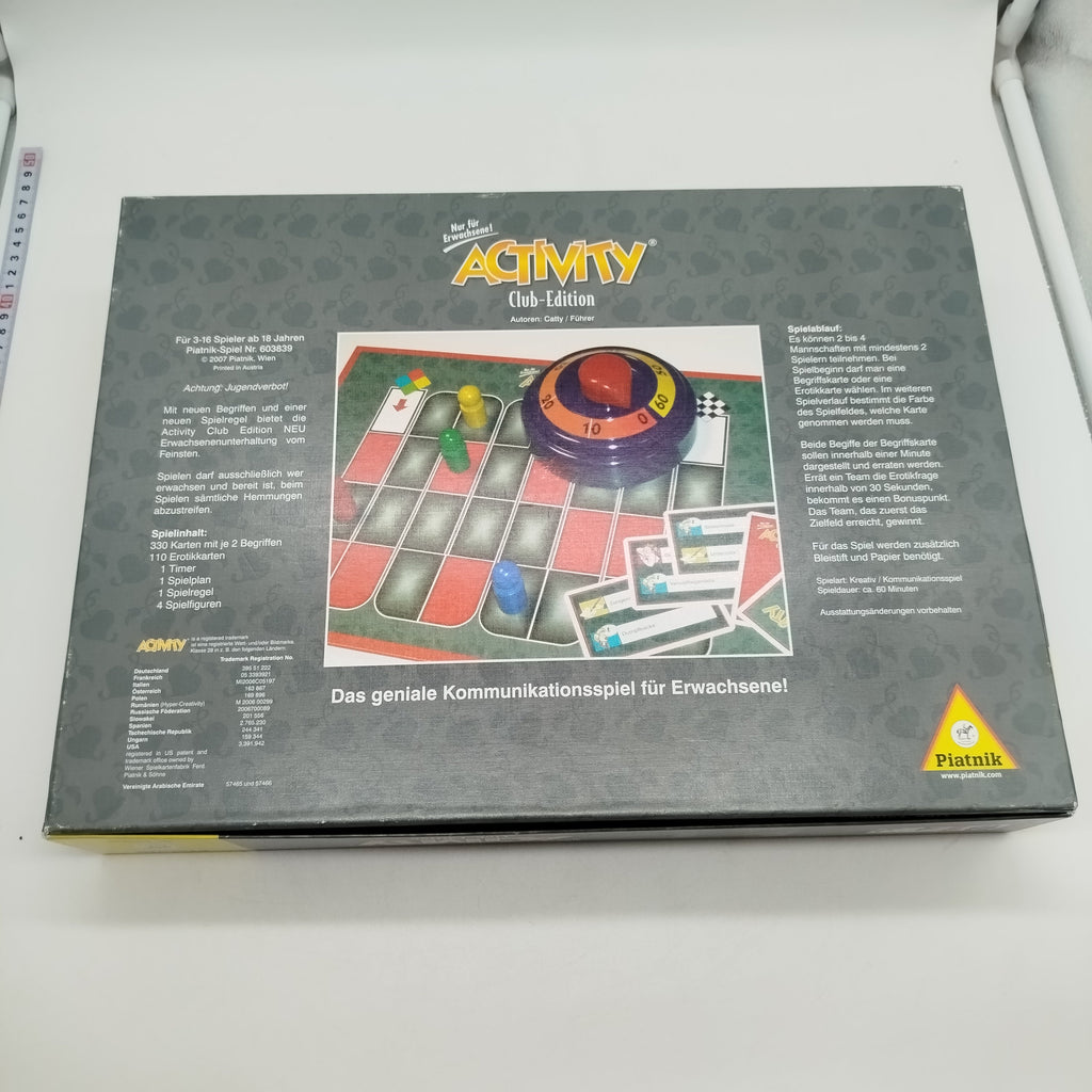 Das Partyspiel Activity Club-Edition – 603639 von Piatnik bietet abwechslungsreiche Spielrunden für Gruppen. Mithilfe eines Spielbretts, Spielfiguren, einem mechanischen Timer und mehreren Kartendecks werden verschiedene Begriffe kreativ dargestellt und erraten. Für 3–16 Spieler; empfohlen für Erwachsene ab 18 Jahren. Allgemeiner Sicherheitshinweis: Nicht für Kinder unter 3 Jahren geeignet.