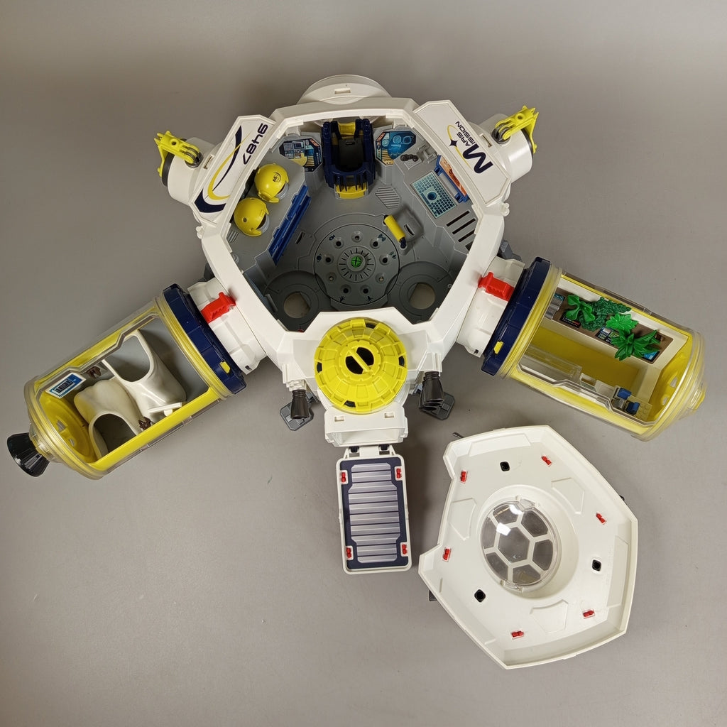 Hol dir die Playmobil Raumstation und starte spannende Missionen im Kinderzimmer! Dieses Set enthält 17 Figuren – 14 Astronauten und 3 Roboter – sowie 12 Zubehörteile wie Helme, Werkzeuge und ein kleines Fahrzeug. Die Station ist modular aufgebaut mit mehreren Kammern und aufklappbarem Dach. Verpackung und Anleitung fehlen, leichte Gebrauchsspuren vorhanden. Die Vollständigkeit konnte nicht überprüft werden. Das Spielzeug befindet sich in gutem gebrauchten Zustand. Hinweis: Nicht für Kinder unter 3 Jahren geeignet, da Kleinteile verschluckt werden können. Gib diesem Spielzeug ein neues Zuhause und fördere kreatives Rollenspiel im Weltraum!