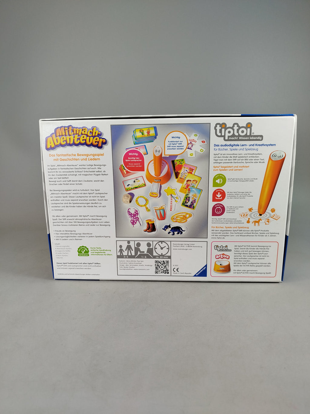 Das Ravensburger tiptoi Spiel „Mitmach-Abenteuer – 00 119“ bietet Kindern ab 3 Jahren ein interaktives Bewegungsspiel mit Geschichten und Liedern. Das Spiel aus der tiptoi active Reihe fördert motorische Fähigkeiten und Konzentration, indem es verschiedene Aktionen und Lernmöglichkeiten kombiniert. Für die Nutzung werden der tiptoi Stift und tiptoi ACTIVE Lautsprecher benötigt. Altersempfehlung: 3–5 Jahre. Nicht für Kinder unter 3 Jahren geeignet.