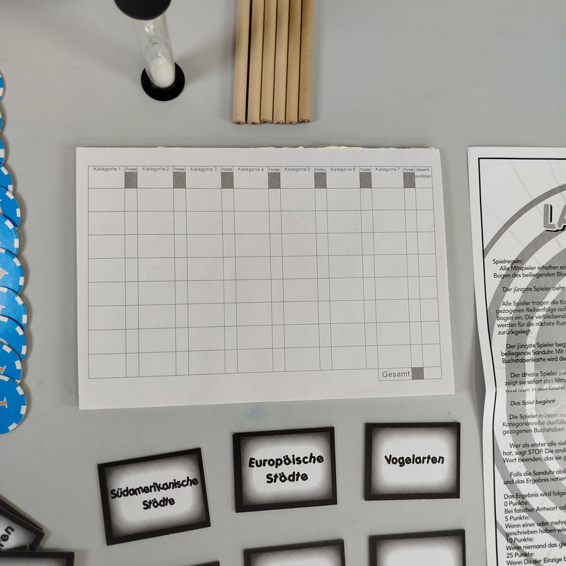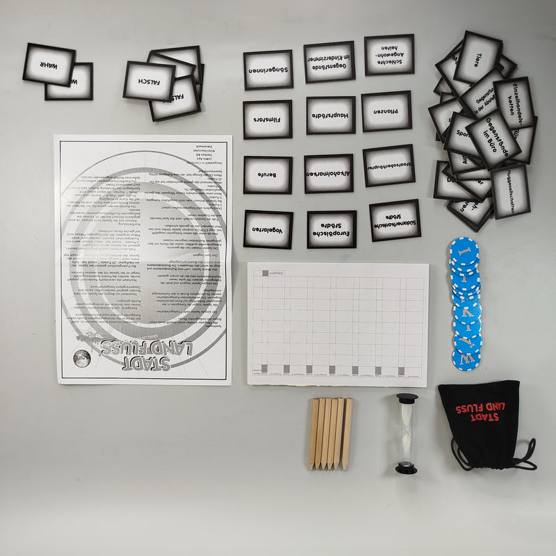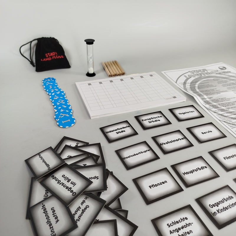 Entdecken Sie das spannende Gesellschafts- und Familienspiel Stadt Land Fluss. Ideal für unterhaltsame Abende mit Freunden und Familie, fördert dieses Spiel Kreativität und Wissen. Spieler nehmen abwechselnd Kategorienkarten, und mit der Sanduhr als Zeitlimit sollen sie so viele Begriffe wie möglich zu den gegebenen Kategorien finden. Enthält Spielkarten, Notizblöcke, eine Sanduhr, Spielfiguren und viele weitere Spielmaterialien für endlosen Spielspaß. Achtung: Nicht geeignet für Kinder unter 3 Jahren aufgrund verschluckbarer Kleinteile.
