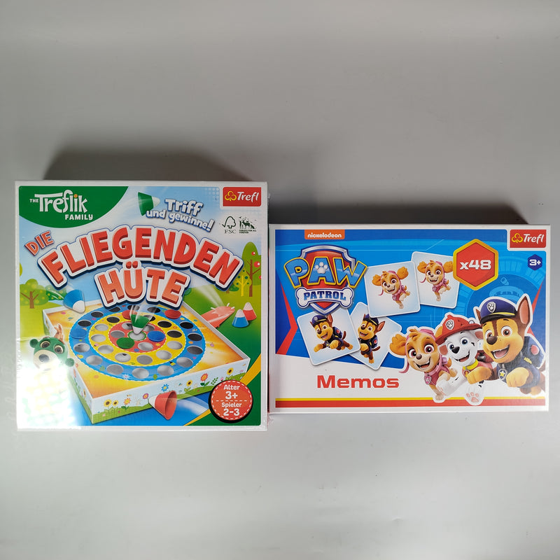 Hol dir das bunte Spieleset bestehend aus Paw Patrol Memo und dem brandneuen Die Fliegenden Hüte! Während das Memo-Spiel mit beliebten Charakteren aus Paw Patrol Gedächtnis und Konzentration fördert, sorgt das actionreiche Hüte-Spiel für viel Bewegung und Spaß. Perfekt für Kinder ab 3 Jahren. Gib diesen Spielen ein neues Zuhause und unterstütze nachhaltigen Spielspaß. Hinweis: "Die Fliegenden Hüte" ist neu und originalverpackt, "Paw Patrol Memo" ist gebraucht und in gutem Zustand.
