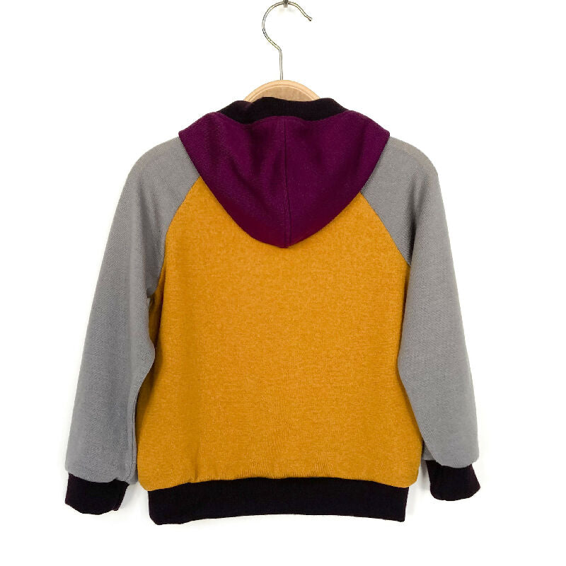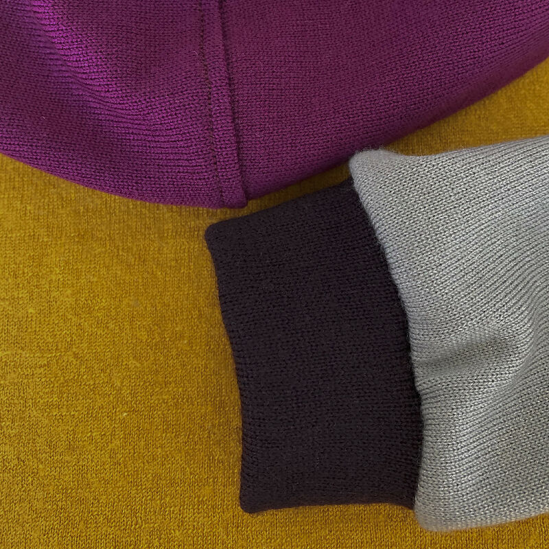 Für diesen Kinderpullover im Colorblockdesign wurden vier feine Merinowollpullover verarbeitet in currygelb, grau und lila sowie dunkelbraun für die Bündchen.