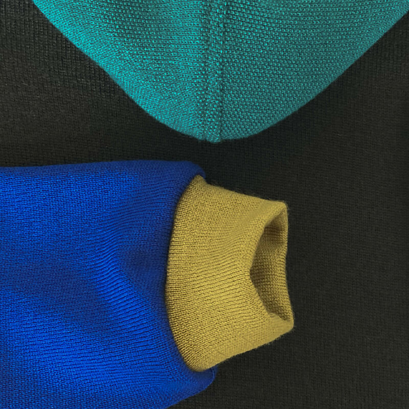 Für diesen Kinderpullover im Colorblockdesign wurden vier feine Merinowollpullover verarbeitet in dunkelbraun royalblau und smaragdgrün sowie ockergelb für die Bündchen.