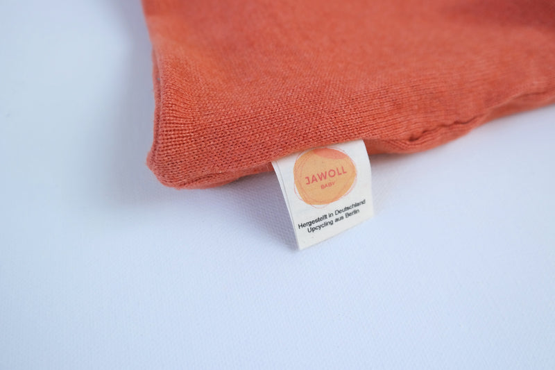 Der orange Faden von Jawoll Baby: Wolle ist biologisch abbaubar – Garn aus Polyester nicht. Ist dieser Nutzungszyklus des Textils zu Ende, siehst du durch die orangen Nähte auf den ersten Blick, wo du Faden und Wolle trennen und damit ein Recycling ermöglichen kannst. Denn nur getrennte Materialien sind über den Hausmüll recycelbar.