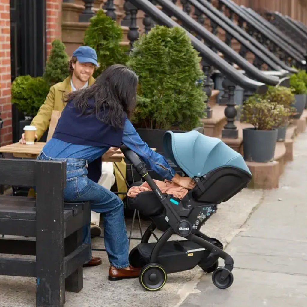 Die Doona X Babyschale vereint i Size Babyschale und Kinderwagen in einem und verwandelt sich in Sekunden vom Autositz zum fahrbereiten Buggy ganz ohne zusätzliches Gestell. Mit einem Klick klappen die integrierten Räder aus sodass Dein Baby nach der Autofahrt bequem weitergeschoben werden kann. Die Liegefunktion mit nahezu flacher Position bis 159° sorgt auch außerhalb des Autos für ergonomischen Komfort. Ein 5 Punkt Gurt nach i Size Standard sowie Federung und atmungsaktive Materialien bieten Sicherheit und angenehmes Fahrgefühl. Dank TÜV geprüfter Flugzeugzulassung ist die Doona X auch ideal für Reisen.
