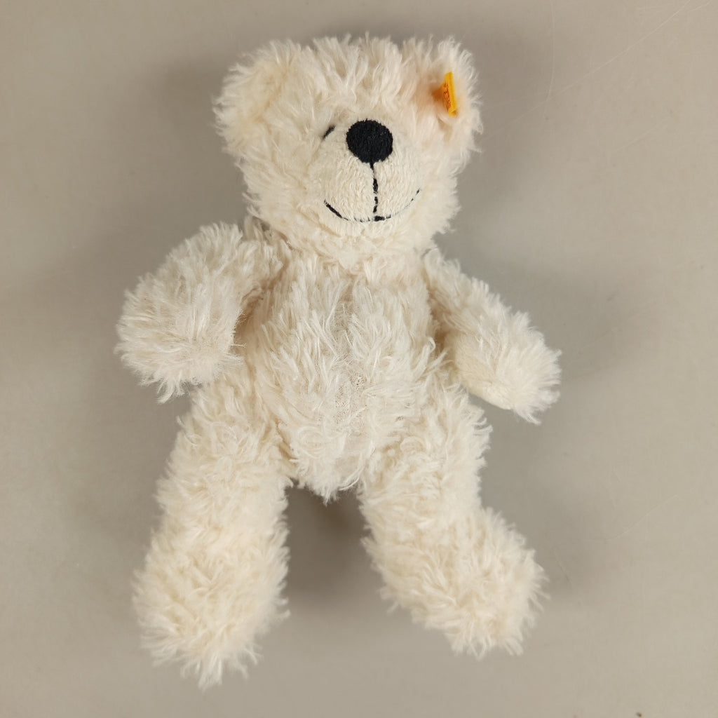 Hol dir den klassischen Steiff Teddybär und genieße ein Stück Kuscheltiergeschichte. Der Bär aus weichem Plüsch ist ca. 18 cm groß, trägt das typische gelbe Ohrfähnchen und eignet sich ideal zum Sammeln oder Liebhaben. Der Teddy zeigt nur minimale Gebrauchsspuren, ist vollständig und ohne Originalverpackung. Gib diesem Plüschtier ein zweites Zuhause und erfreue dich an seiner zeitlosen Qualität. Achtung: Nicht für Kinder unter 3 Jahren geeignet, da Kleinteile verschluckt werden können.