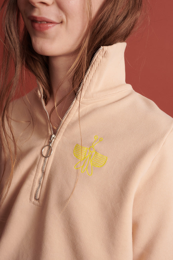 Der Theo Sweater ist aus Bio-Baumwoll Jersey in Nude gefertigt und hat einen schmalen, langen Schnitt und einen hohen Kragen mit langem Zipper . Regular fit.