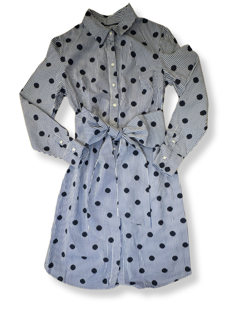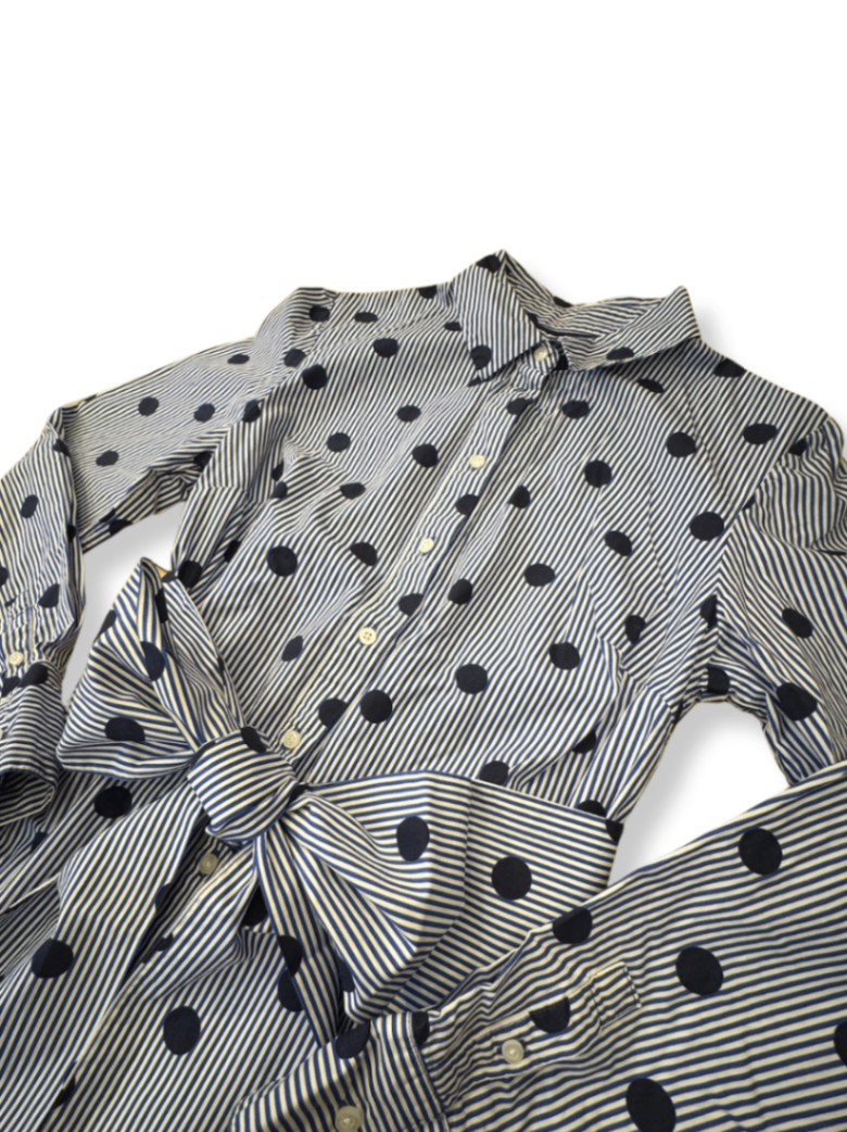 Dieses charmante Hemdkleid verbindet klassisches Streifendesign mit verspielten Punkten in einem frischen Blau-Weiß-Mix.