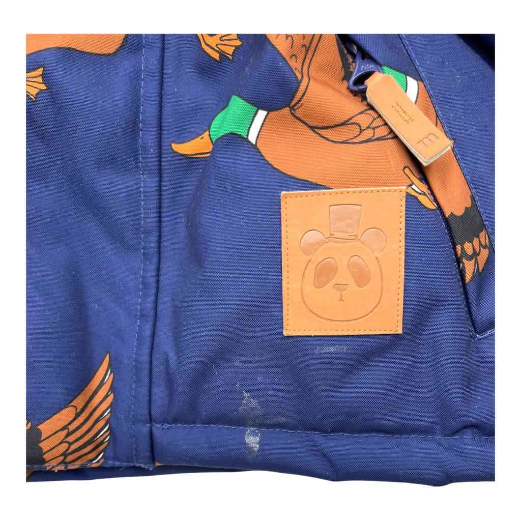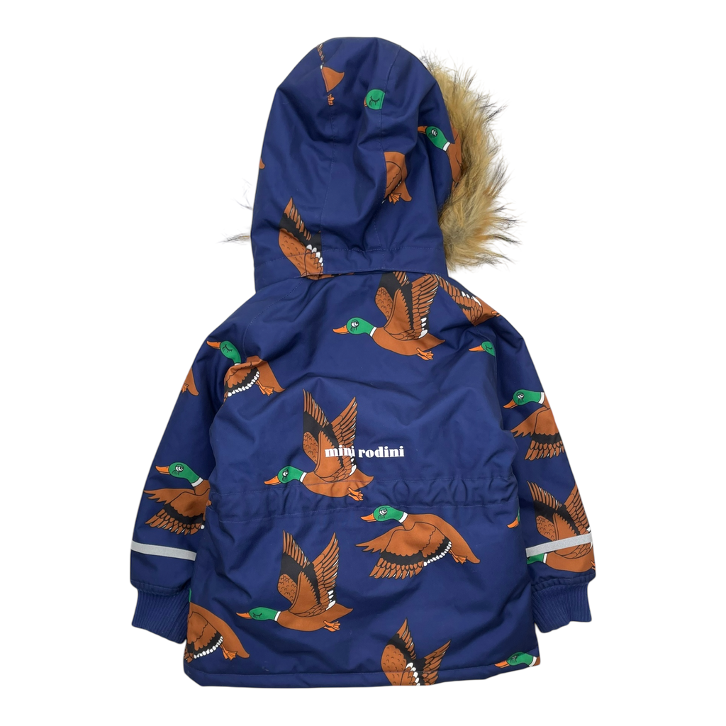 Mini Rodini padded winter jacket with a removable hood with faux fur. The lining is made in polyester satin. The jacket is highly breathable and originally waterproof with 15000 mm water columns. It’s made of a functional and heavy-duty shell fabric with taped seams and BIONIC-FINISH® ECO coating. The soft cuffs at sleeves and inside the collar prevents wind and snow from getting in, and the smartly placed reflectors increase visibility when the days get darker. The jacket has some signs of use especially on the sleeves as shown in the pictures.