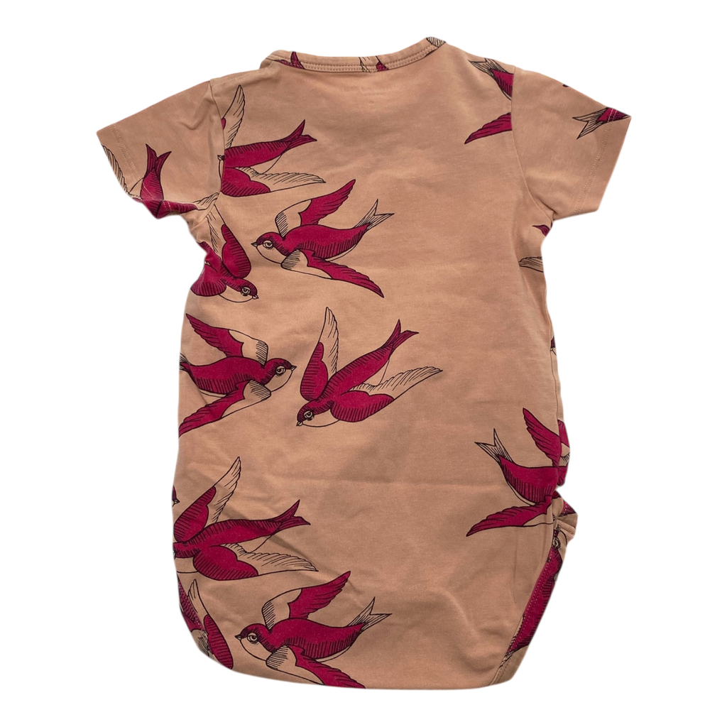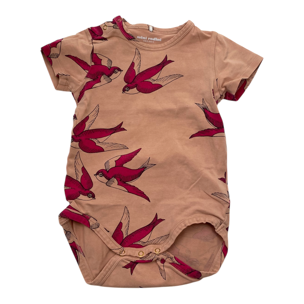 Mini Rodini short sleeve body with snap buttons in bird print. The material has fluffed in use.