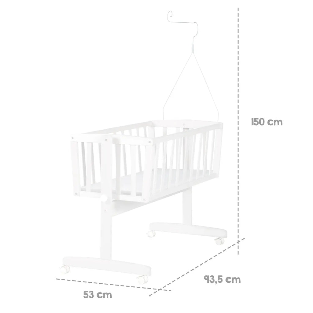 | Lieferumfang | Babywiege, Vliesmatratze, Bettwäscheset (Decke 80x80 cm, Kissen 35x40 cm), gepolsterte Mesh-Umrandung, Himmel, Himmelstange, Bettdecke, Kopfkissen |