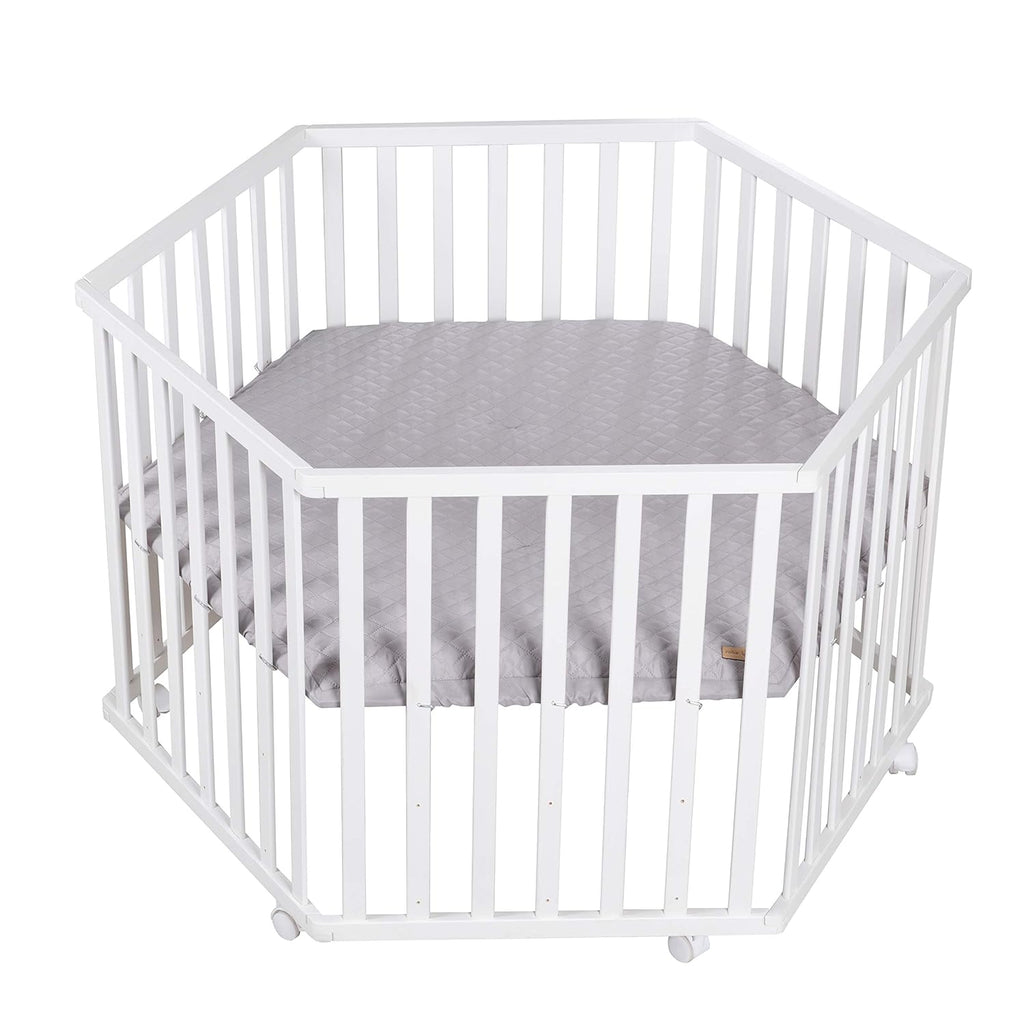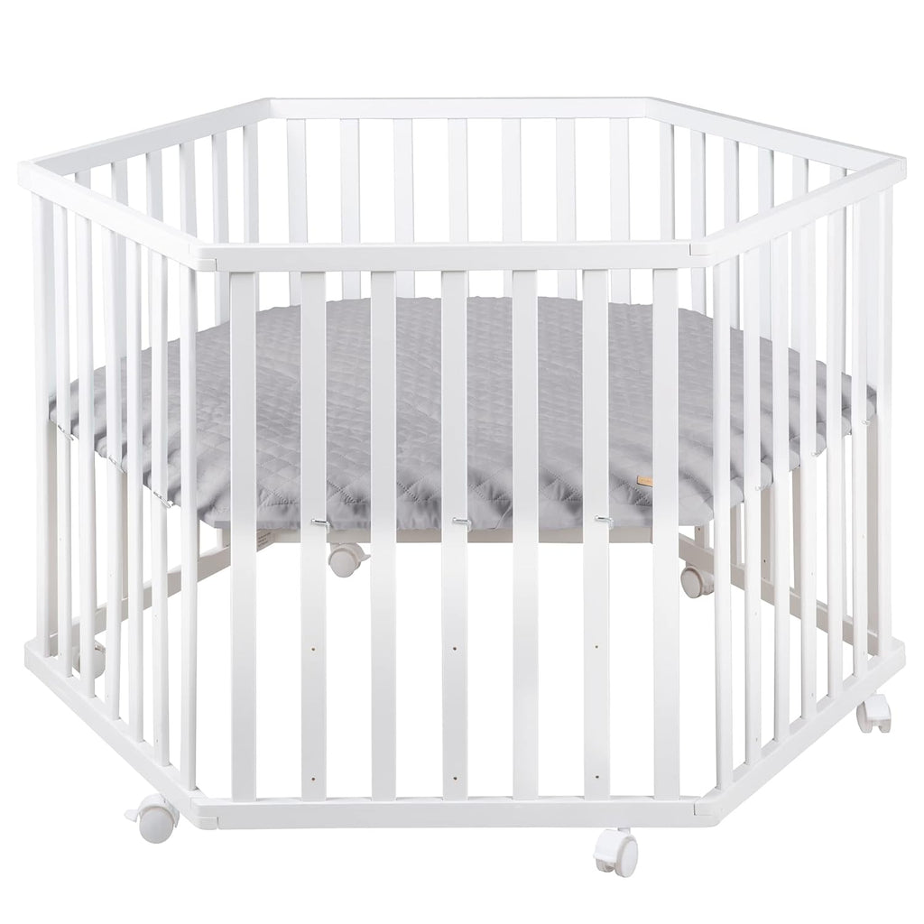 roba Laufgitter 6-eckig - Baby Spielgitter hexagonal + Einlage roba Style grau - 3-fach höhenverstellbar - Mobiler Laufstall mit Rollen - Holz weiß