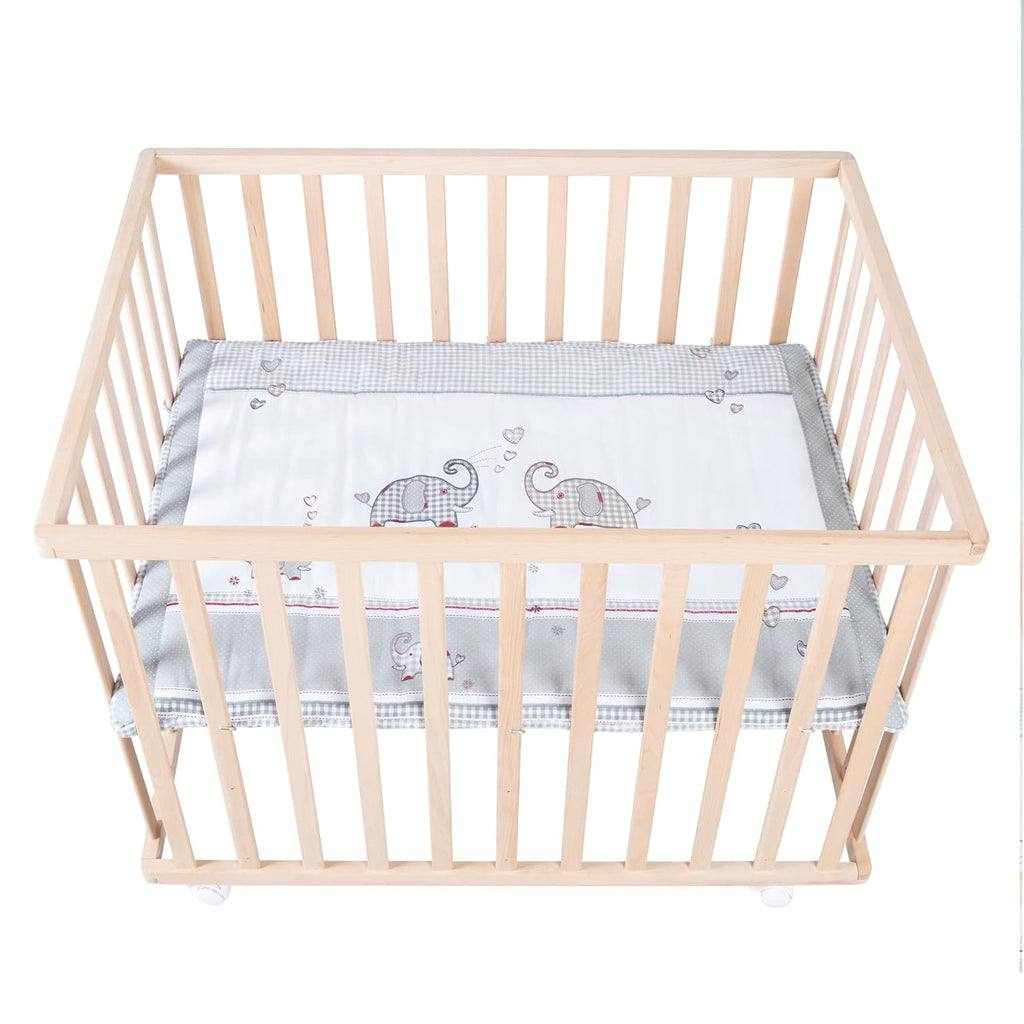 Das praktische roba Laufgitter 75x100 cm ist platzsparend und flexibel einsetzbar, denn es passt durch jede gängige Wohnungstüre. Der sicherheitszertifizierte Laufstall ist mit Flachstäben und mit weich gepolsterter Textileinlage im Design ‚Jumbotwins‘ ausgestattet. Die rückenfreundliche 3-fache Höhenverstellbarkeit lädt Eltern mit Freude zum Spielen mit ihren Babys ein. Die Rollen mit Bremse sorgen bei diesem Laufgitter für einen sicheren Stand und die nötige Mobilität. Das Schutzgitter wurde nach den aktuellsten Sicherheitsstandards in Deutschland nach der aktuellen Norm DIN EN 12227:2010-12 entwickelt. Alle verwendeten Materialien sind zertifiziert und werden regelmässig geprüft. Der verwendete Lack ist lebensmittelecht und hautverträglich. Das Spielgitter kann zum Reinigen mit einem feuchten Tuch abgewischt und die Laufgittereinlage in der Maschine gewaschen werden. Das roba Markenlaufgitter ist bis 15kg belastbar und ein wunderschöner, sicherer Spielplatz von Geburt an der lange Verwendbarkeit garantiert und in dem Kinder gerne die Welt entdecken.