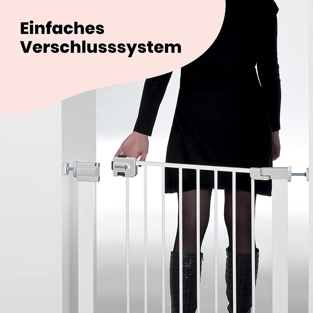 Produktbeschreibung Sie benötigen ein Schutzgitter, das in eine Öffnung zwischen 73 cm und 80 cm oder bis 136 cm passt? Das Safety 1st Easy Close ist ein Treppenschutzgitter für Babys mit einem Easy-Closing-System, das sich schließt, wenn das Schutzgitter für Kinder zugeschlagen oder zugedrückt wird. Einfach zu bedienen und unglaublich sicher. Das breite Treppengitter Safety 1st Easy Close hat einen extra breiten Durchgang und lässt sich mit einer Hand öffnen. Drücken Sie einfach die Knöpfe am Griff, um das Gitter zu öffnen und schlagen oder drücken Sie zu, damit es sich schließt. Die visuelle Anzeige bestätigt, ob das Treppenschutzgitter sicher verschlossen ist. Das Safety 1st Easy Close hat nicht nur ergonomischen Griff, sondern ist auch extrabreit, damit ein bequemes Durchgehen möglich ist. Öffnen Sie das Schutzgitter in eine oder beide Richtungen, je nachdem, wo das Babygitter installiert ist. Für die Installation ist kein Bohren erforderlich, sondern nur eine einfache Druckverschraubung für einen festen Sitz. Verbreitern Sie Safety 1st Easy Close mit dem speziell entwickelten Safety 1st Gate Erweiterungen für größere Öffnungen (separat erhältlich). Safety 1st hat eine Reihe von 7 cm, 14 cm oder 28 cm langen Gitterverlängerungen im Angebot, mit denen sich das Safety 1st Easy Close auf bis zu 136 cm verbreitern lässt. Darüber hinaus bietet Safety 1st auch ein zusätzliches Zubehör mit dem Namen Safety 1st Y-Spindel für Safety 1st Easy Close an Treppengeländer an (separat erhältlich). ACHTUNG: Die Lücke zwischen Rahmen und Griff beim Herausnehmen aus der Verpackung gehört zum Design. Diese Lücke schließt sich, wenn das Schutzgitter für Kinder richtig in Ihren Türrahmen eingebaut ist (siehe Anleitungsvideo). Warnhinweise WARNUNG - Lesen Sie vor der Installation die Anweisungen, da eine falsche Installation gefährlich sein kann. WARNUNG - Diese Sicherheitsbarriere darf nicht an Fenstern angebracht werden. WARNUNG - Niemals ohne Wand Befestigung verwenden (alle Befestigungen sind für das Produkt erforderlich).