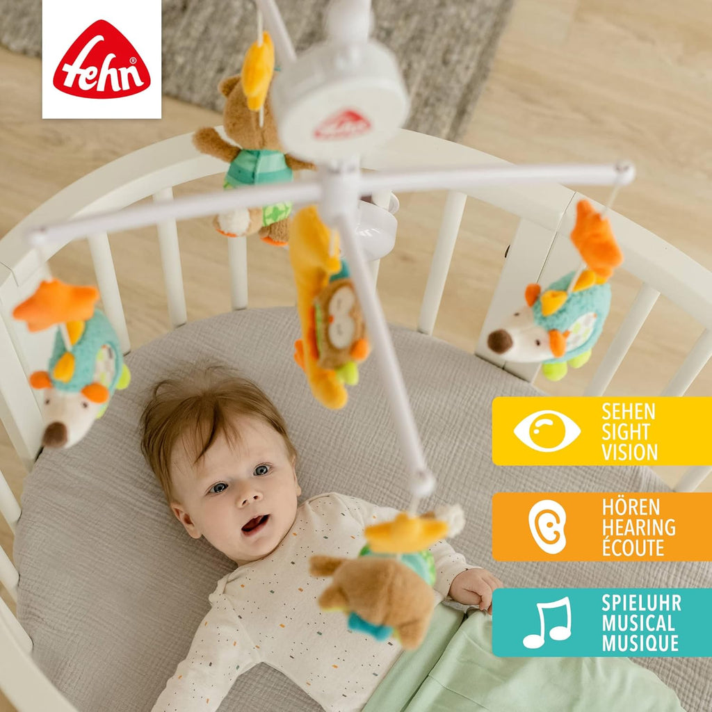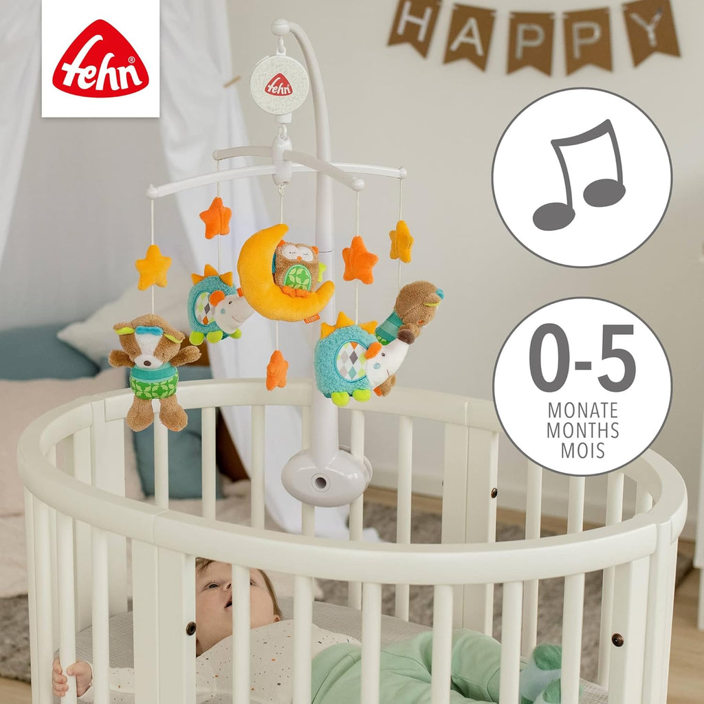 über für Spielspaß und sind abends treue Einschlafhelfer.Produktinformationen:Musik-Mobile aus der Kollektion Sleeping ForestMit fünf Igel-, Eule-, Fuchs- und Mond-FigurenFür Babys und Kleinkinder von 0-5 MonatenDas Mobile kann ganz einfach am Babybett befestigt werdenSpieluhrmelodie: Weißt du wieviel Sternlein stehenMechanische Spieluhr kann durch den An/Aus-Schalter betätigt werdenObermaterial: Softvelours, Softvlies, BaumwolleStoff-Figuren bei 30°C waschbarIdeal als Geschenk zur Geburt, Taufe oder als Geburtstagsgeschenk für Babys und KleinkinderVon unabhängigen Testinstituten auf Sicherheit geprüftFehnDas deutsche Unternehmen Fehn produziert innovatives Qualitätsspielzeug für Babys von Geburt an. Die liebevoll gestalteten Baby-