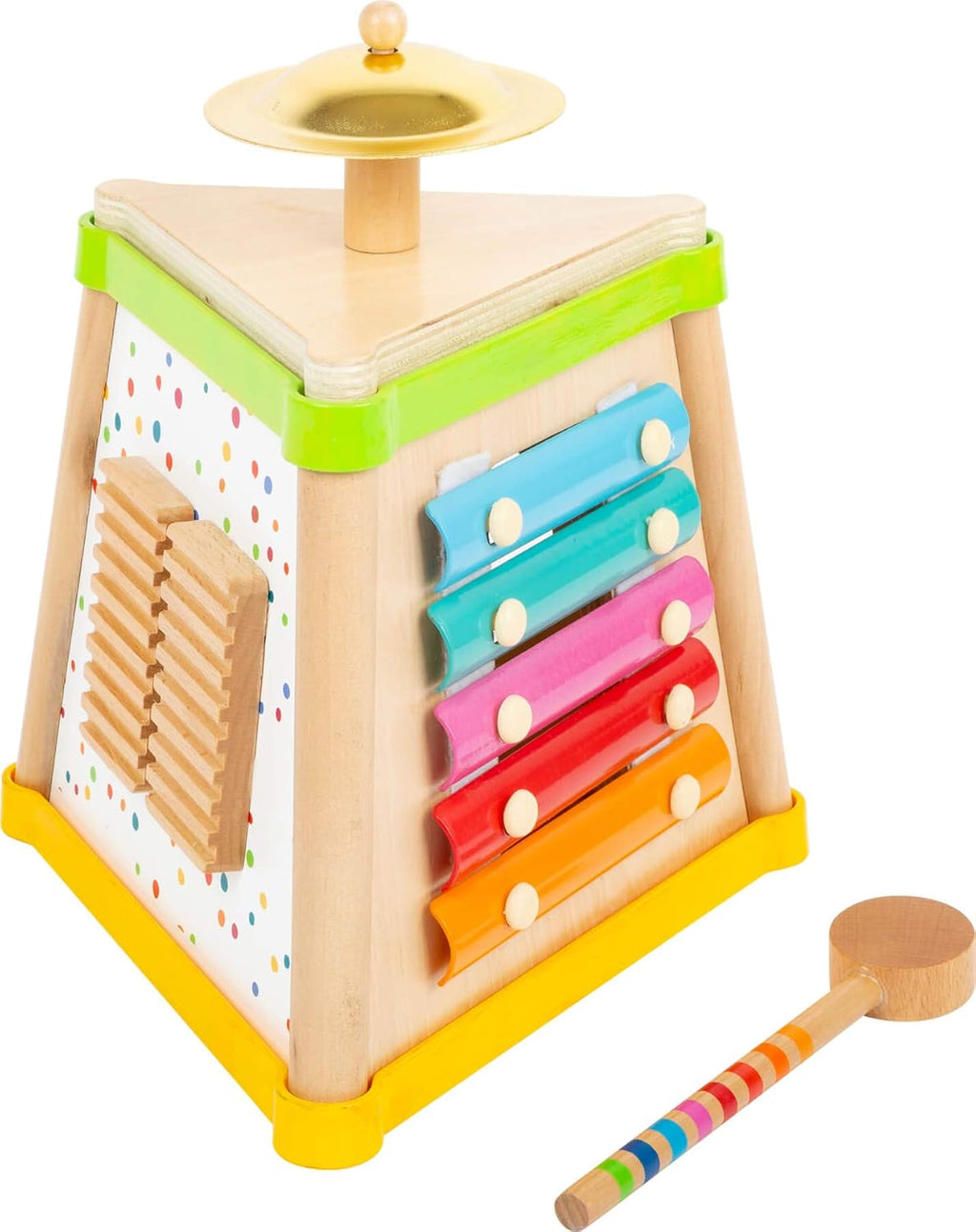 - Das kompakte Musikdreieck verfügt über eine Trommel, ein Xylophon, Klanghölzer und ein Becken