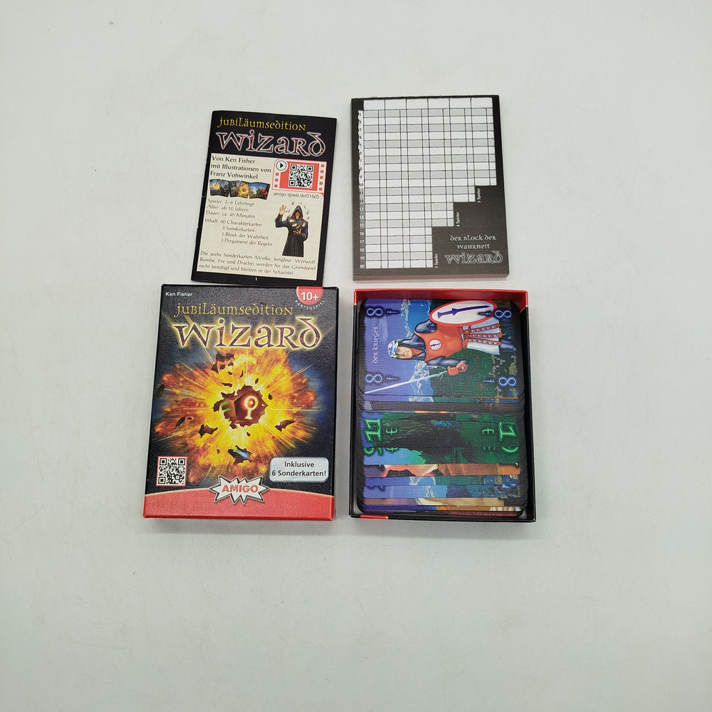 Hol dir das Wizard Jubiläumsedition Kartenspiel von Amigo und erlebe spannende Stichrunden mit bis zu 6 Personen. Die Jubiläumsedition enthält 66 Spielkarten für 3–6 Spieler sowie 6 Sonderkarten und den „Block der Wahrheit“ zum Mitschreiben der Punkte. Dazu gehört auch die Spielanleitung. Das taktische Kartenspiel fördert Strategie und Vorausplanung und eignet sich für Kinder ab 10 Jahren und Erwachsene. Gib diesem Spiel ein neues Zuhause und bring frischen Spielspaß an den Tisch.