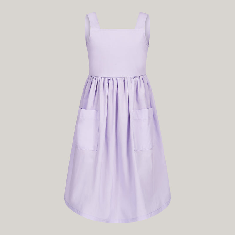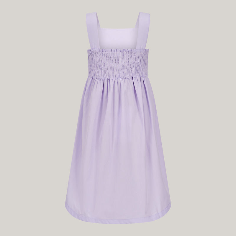 Für alle, die coole Einfachheit lieben und nicht wissen, wohin mit den Händen: Dieses ärmellose Kleid mit breiten Trägern hat große, praktische Taschen – perfekt für kleine Entdeckerinnen und Sammlerinnen. Das helle Violett wertet jeden Look auf.