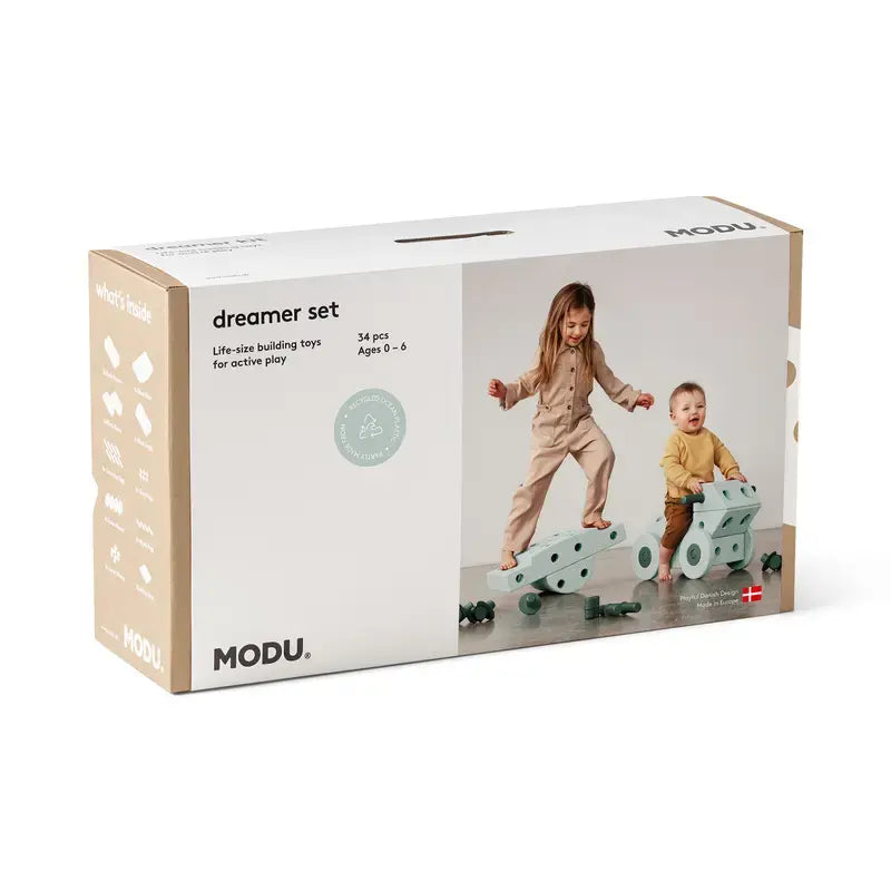 Das MODU Dreamer Set ist ein vielseitiges Bauset für Kinder ab 0 bis 6 Jahren. Mit 34 Teilen ermöglicht es über 25 lebensgroße, kreative Konstruktionen wie Lauflernwagen, Rutschauto oder Indoor-Rutsche. Alle Elemente bestehen aus recycelbarem EPP-Schaum und ABS in Lebensmittelqualität, kombiniert mit nachhaltigen Materialien. Die Farben Ocean Mint und Forest Green sorgen für ein modernes Design, während das Set ideal zum Teilen unter Geschwistern geeignet ist.