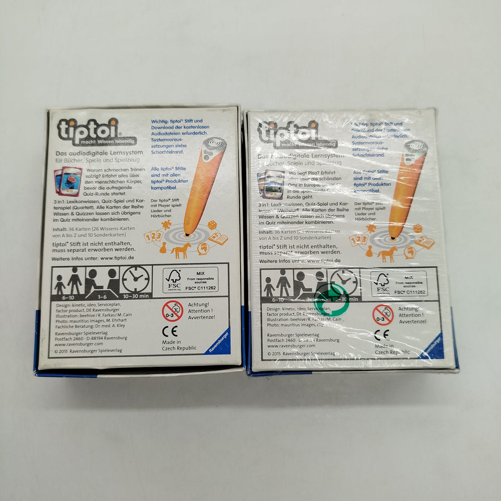 Hol dir das tiptoi Wissen & Quizzen Spielset von Ravensburger mit den Ausgaben „Menschlicher Körper von A–Z“ und „Schöne Orte Europas von A–Z“. Ideal für 1–6 Spieler ab 6 Jahren, mit spannenden Quizfragen, Lexikonwissen und Lernkarten. OVP mit leichten Gebrauchsspuren, vollständig und mit Anleitung. Der tiptoi Stift ist nicht enthalten. Das Set befindet sich in einem sehr guten gebrauchten Zustand. FSC-zertifiziert, hergestellt in Tschechien. Hinweis: Nicht für Kinder unter 3 Jahren geeignet, da Kleinteile enthalten sind.