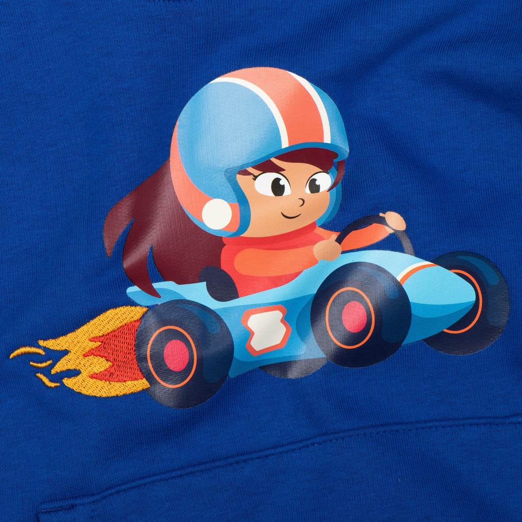 Auf der Vorderseite des leuchtend blauen Pullovers ist eine Rennfahrerin abgebildet, die mitten in einem Rennen steckt. Die Auspuffflamme ist zweifarbig bestickt und sticht visuell hervor. Unser Markenlabel "Who said" mit dem Slogan "All Colours Are For Everyone" befindet sich auf über dem Saum auf der Rückseite.