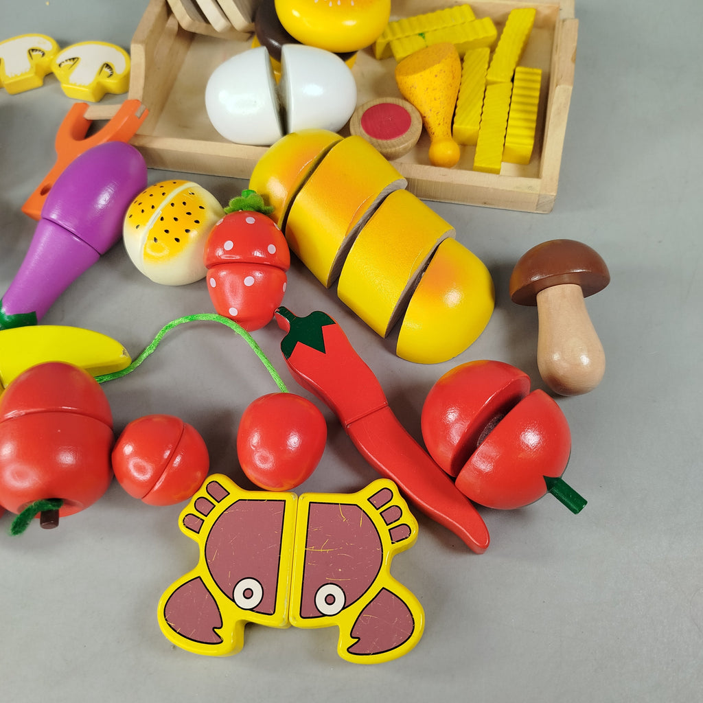Hol dir das Erzi Holzspielzeug Lebensmittel-Set mit 30 bunten Teilen wie Obst, Gemüse, Pommes, Brot, Burger, Pilz, Krabbe und Hähnchenkeule. Dazu gehören auch drei kleine Holzutensilien. Ideal für kreatives Rollenspiel in der Kinderküche. Das Set zeigt sichtbare Gebrauchsspuren und die Vollständigkeit konnte nicht überprüft werden. Gib diesem nachhaltigen Spielzeug ein neues Zuhause und fördere spielerisch Fantasie und Alltagsverständnis. Hinweis: Nicht für Kinder unter 3 Jahren geeignet – Erstickungsgefahr durch Kleinteile.