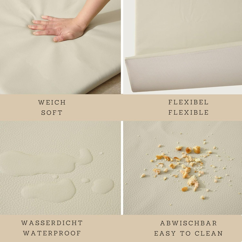 • Langlebig und einfach zu montieren: Gefertigt aus hochwertigem Memory-Schaum mit 2 cm Stärke, kehrt die Matte innerhalb von 1-2 Tagen in ihre ursprüngliche Form zurück – ein klarer Vorteil gegenüber günstigeren Alternativen. Die Montage ist unkompliziert: Legen Sie die Matte in den Bezug aus veganem Leder, schließen Sie den Reißverschluss – und schon ist die Baby Krabbeldecke einsatzbereit.