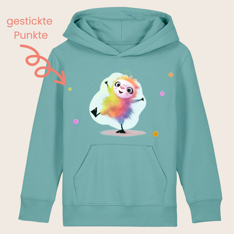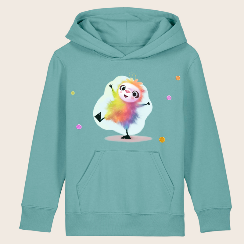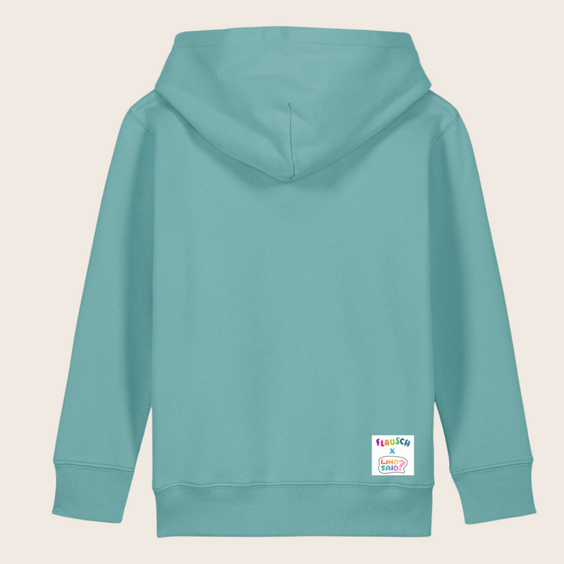 Mit dem türkisen Hoodie wird die Welt von Flausch Teil des täglichen Lebens Eures Kindes. Es trägt die liebevollen Botschaften des Buches mit sich und wird darin bestärkt, dass es genau richtig ist, so wie es ist.