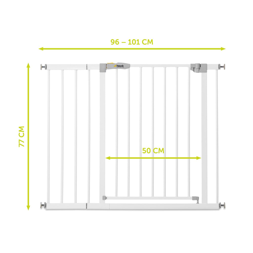Produktbeschreibung Dieses Kinderschutzgitter ist ideal zur Absicherung von Türen bzw. Treppen mit einer Breite von 96 - 101 cm. Für kleinere Durchgänge empfehlen wir den Baby Gitterschutz Open N Stop KD inkl. 9 cm Verlängerung (84-89 cm) bzw. für Standardmaße das Open N Stop KD (75-80 cm). Alle diese Modelle können nochmals mit Verlängerungen von 9 cm und 21 cm individuell erweitert und mit Y-Spindeln kombiniert werden, um sie an Treppengeländern mit Rundholmen zu befestigen.Die Montage vom Treppengitter ist im Handumdrehen erledigt. Das Metallschutzgitter wird mittels Klemmschrauben zwischen Wänden oder Türrahmen eingespannt. Es muss nicht gebohrt werden.Das Open N Stop KD Türgitter lässt sich mit nur einer Hand in beide Richtungen öffnen. Die andere Hand ist dadurch immer für den kleinen Schatz frei. Das Schutzgitter hat einen manuellen Schließmechanismus und rastet zuverlässig im kindersicheren Verschluss ein. Dank Zweifach-Sicherung können es nur Erwachsene bedienen.Mit Verlängerungen von 9 cm bzw. 21 cm kann das Absperrgitter flexibel bis auf eine Breite von 122 cm erweitert werden. Für Treppengeländer mit runden oder ovalen Holmen empfehlen wir zusätzlich die hauck Y-Spindeln als Anbauteil. (optionales Zubehör)Hieraus ergeben sich folgende Kombinationsmöglichkeiten:75 - 80 cm = Kindergitter (ohne Verlängerung)96 - 101 cm = Kindergitter inklusive 21 cm Verlängerung