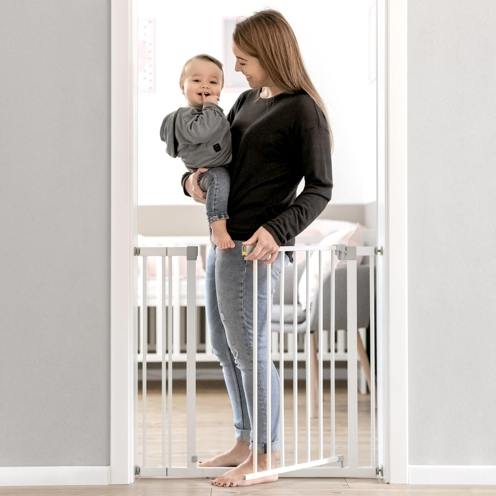 117 - 122 cm = Kindergitter inklusive 21 cm Verlängerung + 21 cm Verlängerung (optional)Mit diesem Tür- und Treppenschutzgitter können Sie Ihr Zuhause für Kinder aber auch für Hunde sicher gestalten.Hinweis: