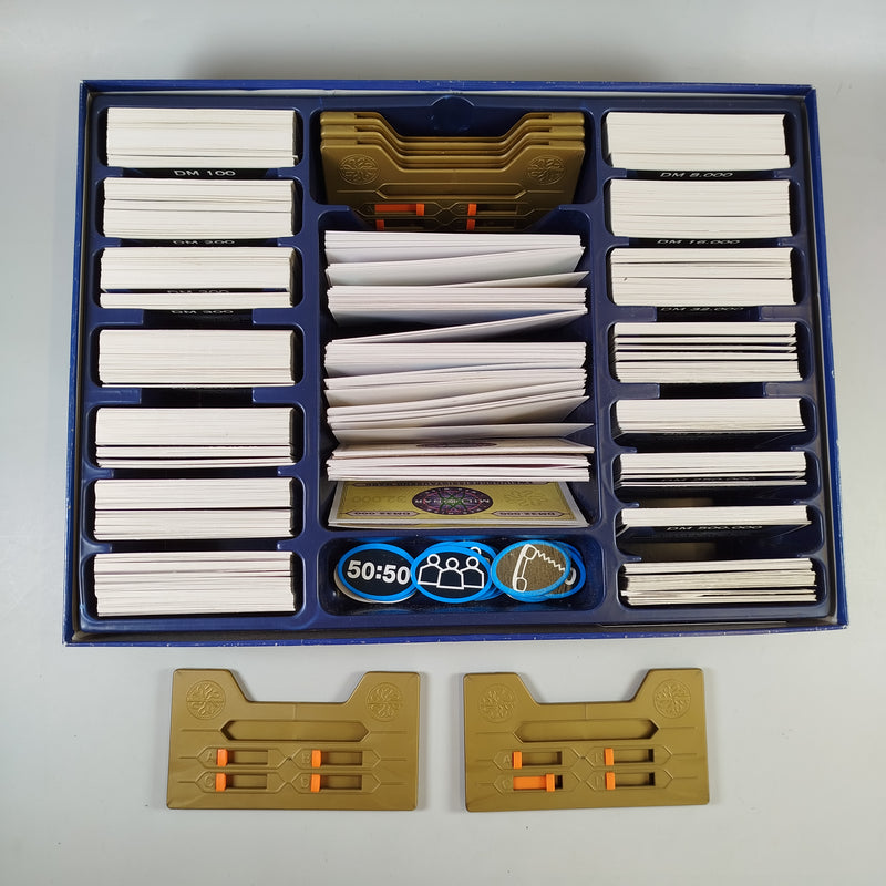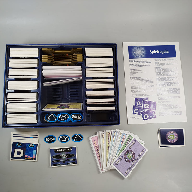 "Wer wird Millionär?" ist das offizielle Brettspiel zur beliebten RTL-Quizshow. Die Spieler treten als Kandidaten an und beantworten Fragen aus verschiedenen Wissensbereichen, um sich bis zur Million hochzuspielen. Mithilfe der bekannten Joker – 50:50, Publikumsjoker und Telefonjoker – kann man knifflige Fragen meistern. Das Spiel enthält über 2000 Fragen und 1000 Karten für stundenlangen Ratespaß mit Familie und Freunden. Hinweis: Das Spiel ist in gutem gebrauchten Zustand, die Verpackung weist leichte Gebrauchsspuren auf.