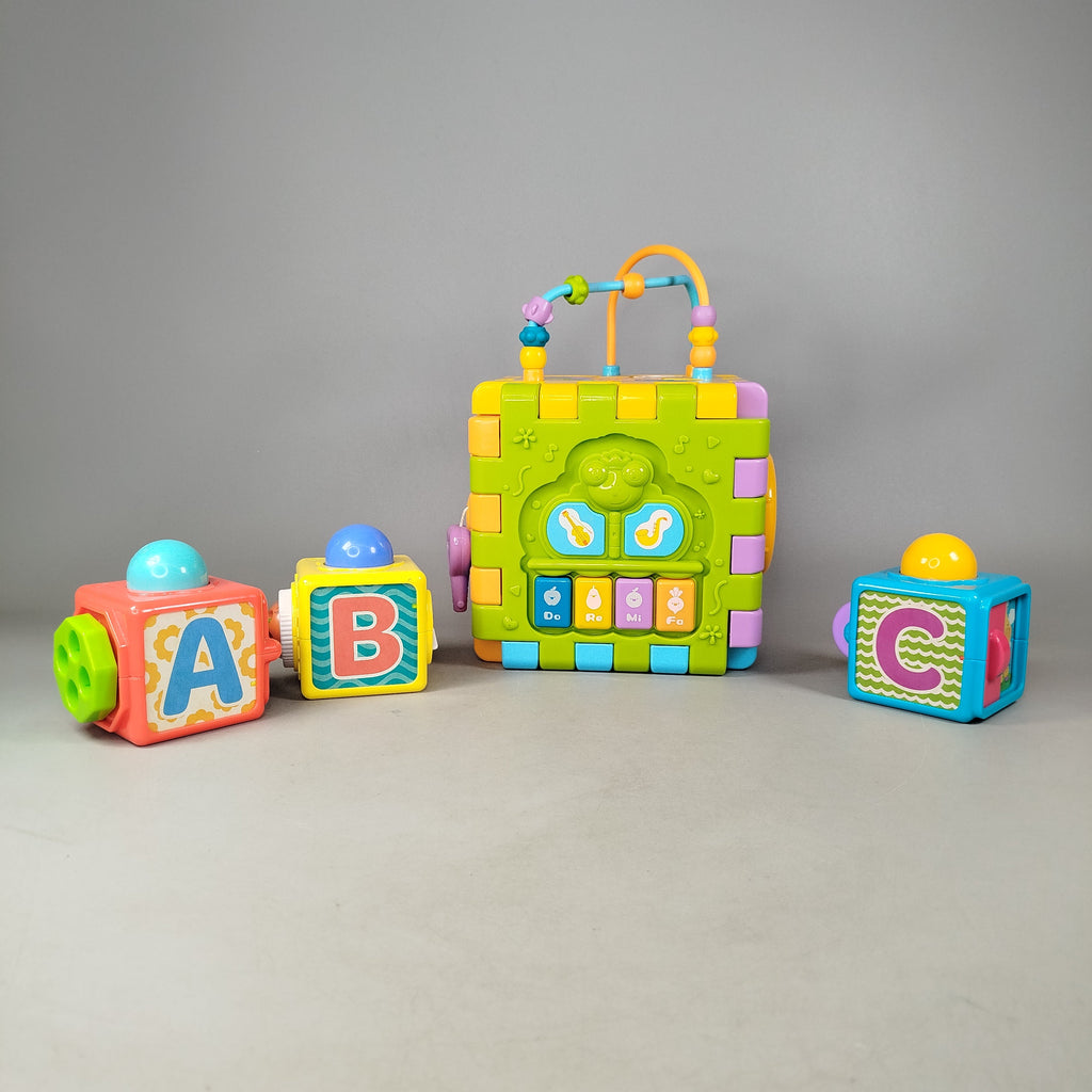 Hol dir den farbenfrohen Activity-Würfel von Mattel mit sechs abnehmbaren Lernblöcken! Der Würfel bietet zahlreiche Funktionen wie Dreh-, Schiebe- und Drückelemente sowie Klaviertasten mit den Tönen Do, Re, Mi und Fa. Ideal, um Motorik und erstes Lernen von Buchstaben und Zahlen zu fördern. Das Spielzeug ist gebraucht und befindet sich in gutem Zustand mit sichtbaren Gebrauchsspuren. Die Originalverpackung fehlt, Vollständigkeit konnte nicht überprüft werden. Hinweis: Nicht geeignet für Kinder unter 3 Jahren wegen verschluckbarer Kleinteile.