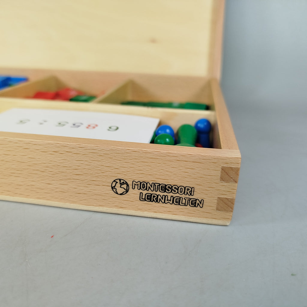 Hol dir das Montessori Lernwelten Markenspiel und entdecke spielerisch die Welt der Zahlen. Das mathematische Lernspiel arbeitet mit farbcodierten Plättchen für Einer, Zehner, Hunderter und Tausender sowie Rechenkarten mit Aufgaben zu Addition, Subtraktion, Multiplikation und Division. Alles ist übersichtlich in einer Holzbox sortiert und unterstützt selbstständiges Lernen. Gib diesem Lernmaterial ein zweites Leben und fördere nachhaltiges Spielen. Hinweis: Enthält Kleinteile.