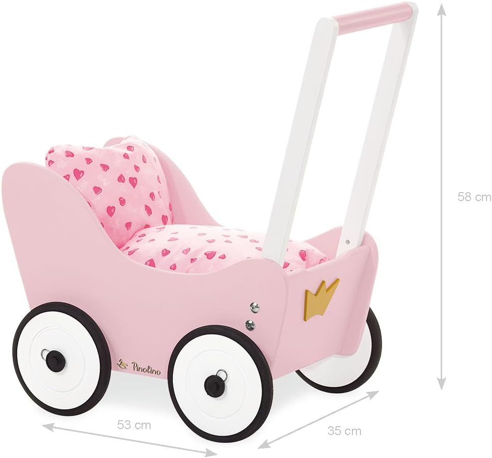 Pinolino Puppenwagen Prinzessin Lea, aus Holz, mit Bremssystem, Lauflernhilfe mit gummierten Holzrädern, für Kinder von 1 – 6 J., rosa, weiß und gold