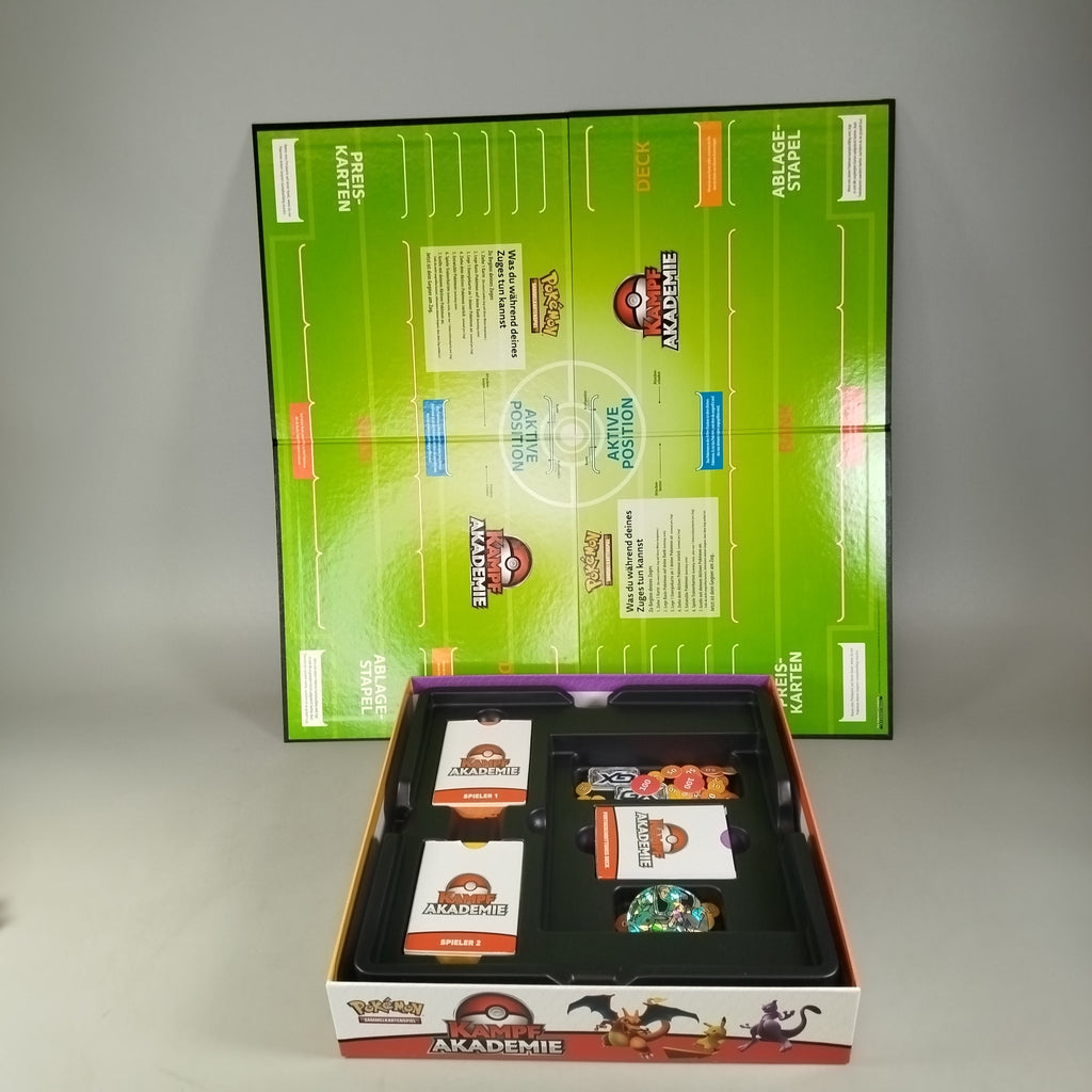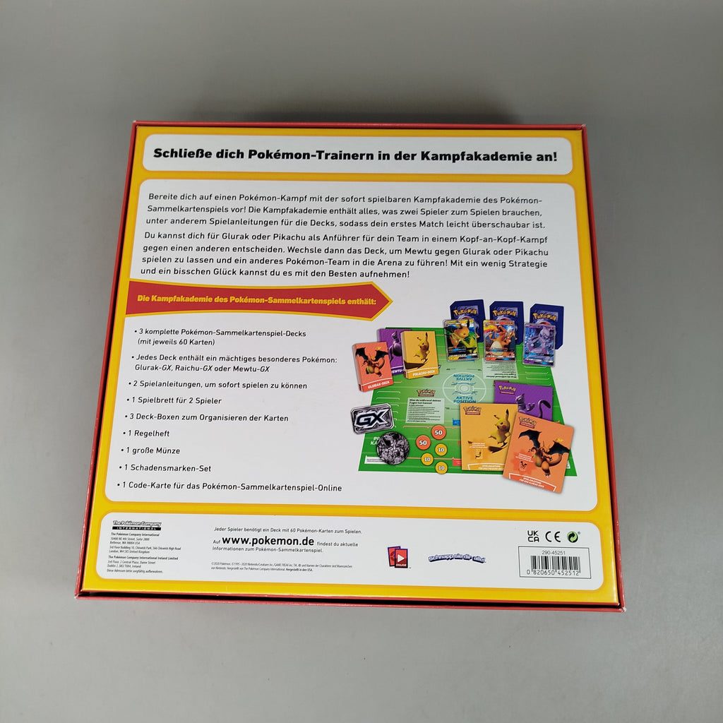 Hol dir die Pokémon Kampf Akademie und starte spannende Duelle mit Familie und Freunden! Das Set enthält drei komplette 60-Karten-Decks mit Glurak-GX, Raichu-GX und Mewtu-GX sowie Spielbrett, Anleitung, Münze, Schadensmarker und Regelbuch. Ideal für Einsteiger ab 6 Jahren. Die Vollständigkeit konnte nicht überprüft werden. Das Spiel befindet sich in einem guten gebrauchten Zustand, Verpackung mit leichten Gebrauchsspuren. Gib diesem Spiel ein neues Zuhause und entdecke die Welt der Pokémon!