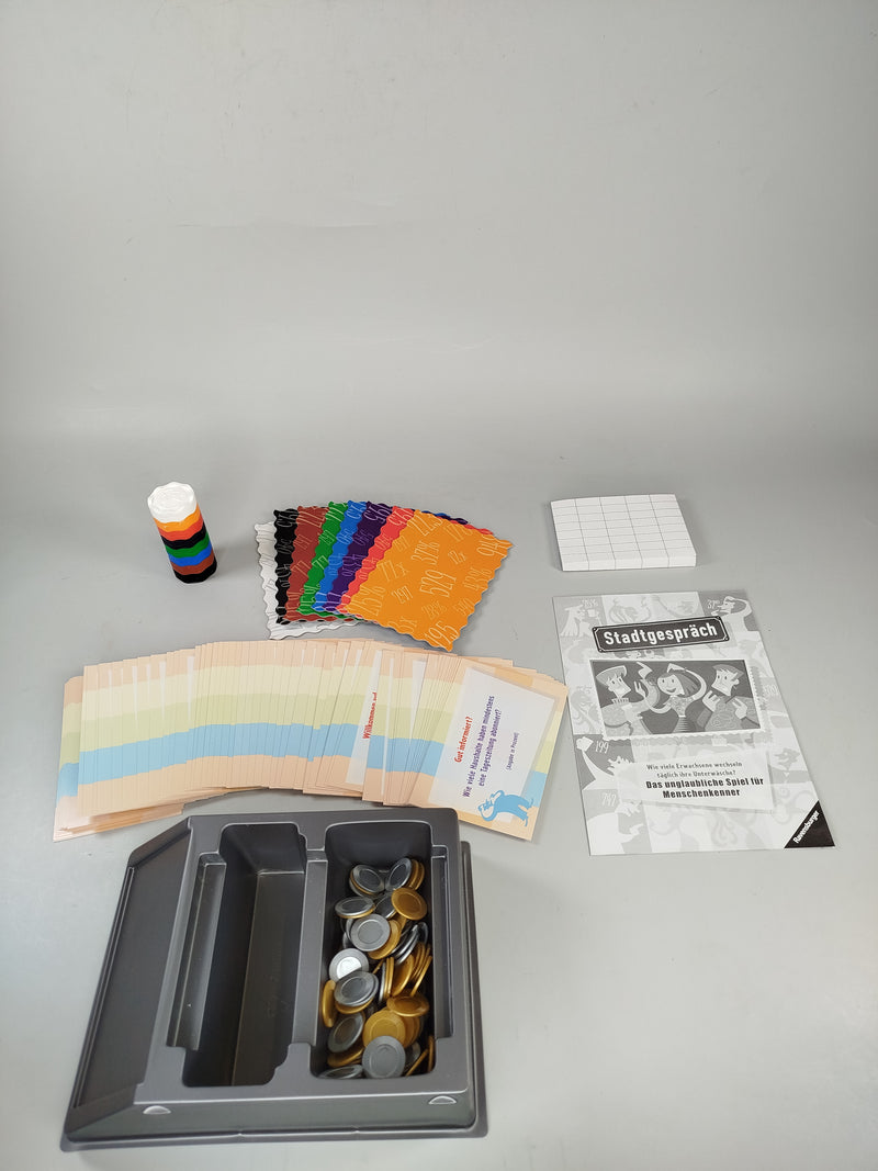 "Stadtgespräch" ist ein unterhaltsames Gesellschaftsspiel, das spannende Diskussionen und Gespräche anregt. Hol dir das spannende Brettspiel Stadtgespräch von Ravensburger und finde heraus, wie gut du Menschen wirklich kennst! Dieses unglaubliche Spiel für Menschenkenner fordert dich heraus, alltägliche Rätsel zu lösen und Gespräche mit Witz und Verstand zu führen. Das Set enthält Spielkarten, Münzen und Anzeigetafeln und bietet alles, was man für eine gesellige Runden mit Freunden oder Familie braucht!