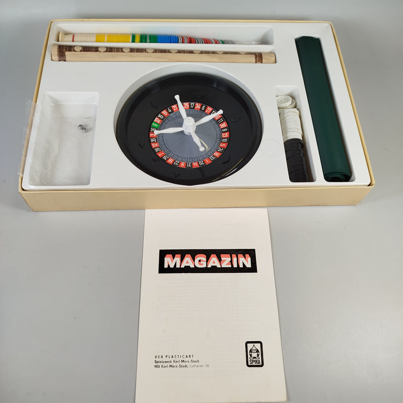 Das "Magazin" Spielset von Spika bietet eine vielseitige Auswahl an klassischen Spielen in einem Set. Enthalten sind ein Roulette-Spiel mit Drehscheibe, Jetons und Spielmatte sowie ein Schach- und Mühlespielbrett. Das Set wurde in der ehemaligen DDR hergestellt und zeichnet sich durch sein nostalgisches Design aus. Ideal für Sammler und Liebhaber klassischer Brett- und Glücksspiele. Sicherheitshinweis: Nicht für Kinder unter 3 Jahren geeignet, da Kleinteile verschluckt werden können.