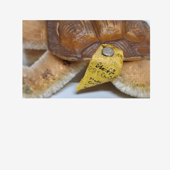 Der kleine Schildkröte Slo 2310.00 ist ein süßes Stofftier mit Fahne und charakteristischem Knopf am Panzer.