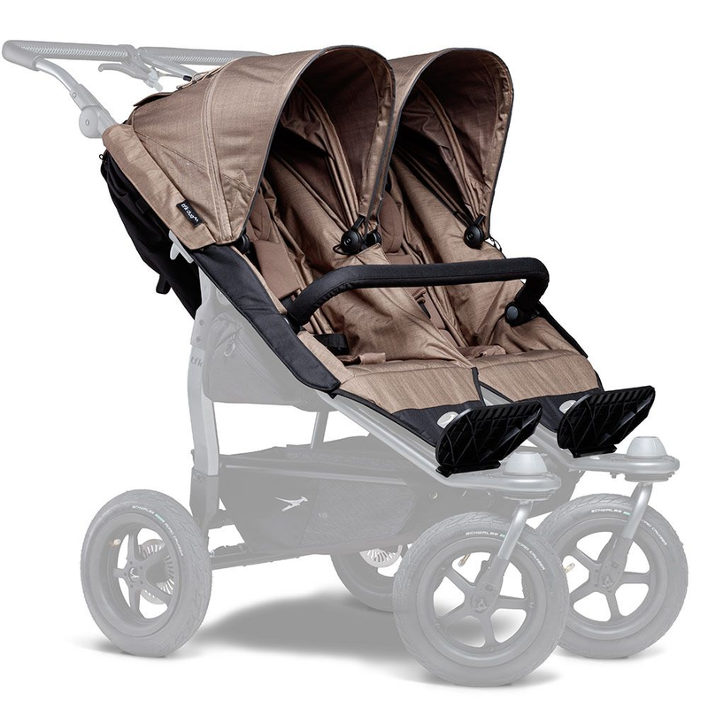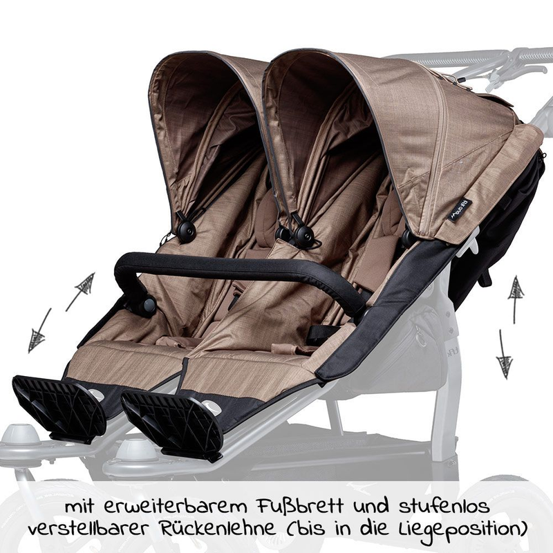Die XXL-Komfortsitze für den Geschwister- und Zwillingswagen Duo - Braun ermöglichen die Nutzung Deines Kinderwagens Duo über das Kleinkindalter hinaus. Auch Kinder im Kindergartenalter werden bei Wanderungen und längeren Aufenthalten im Freien irgendwann müde. Im Sportsitz können sie sich zwischendurch ausruhen - oder auch einfach mal die Augen zumachen. Die Sitzflächne der Sportsitze sind stufenlos bis in die Liegeposition verstellbar um sie optimal den Bedürfnissen Deiner Kinder anpassen zu können. Hier findet Dein Nachwuchs im Alter von mind. 9 Monaten bis ca. 4 bis 5 Jahren (Gesamtbelastung von 45 kg) bequem Platz. Zusätzlich sind die Sitze mit erweiterbaren Fußbrettern ausgestattet. So können Deine Kleider in jedem Alter bequem die Füße hochlegen. Sicherheit muss dabei sein: Deshalb ist jede Sitzeinheit nicht nur mit einem Kopfpolster sondern auch mit einem gut gepolstertem 5-Punkt-Gurtsystem ausgestattet. Die beiden Sitzeinheiten teilen sich einen großen, gepolsterten Schutzbügel, der sich für den leichten Ein- und Ausstieg öffnen lässt. Für Schatten im Inneren sorgen zwei große, ausziehbare Verdecke. Wird es Draußen einmal ungemüglich, kommen in die beiden in die Rückseite der Sitze integrierten Regenverdecke zum Einsatz.
