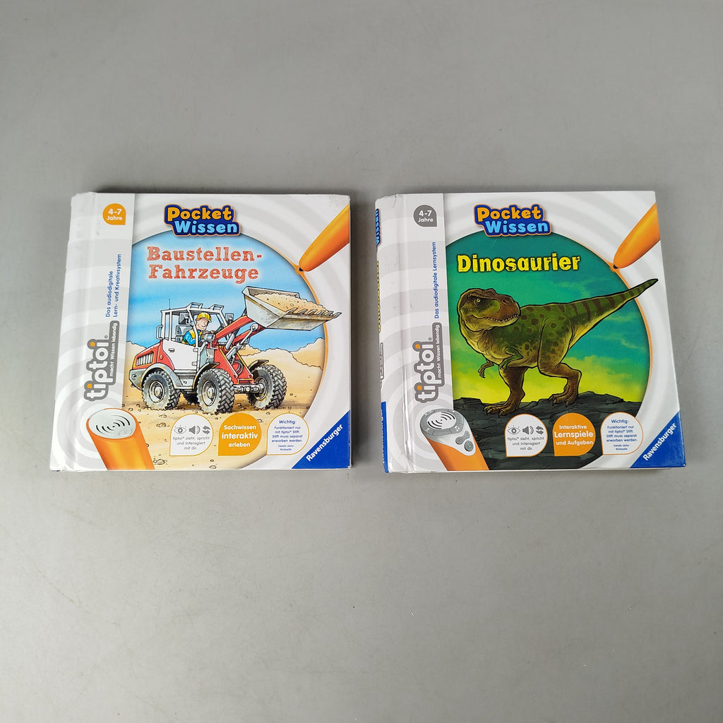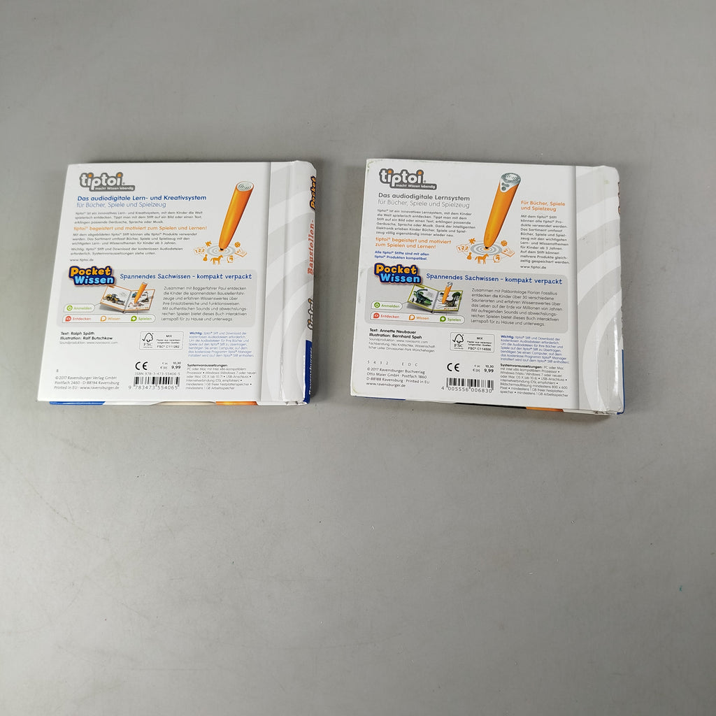 Hol dir die Ravensburger Tiptoi Pocket Wissen Bücher „Baustellen-Fahrzeuge“ und „Dinosaurier“ und entdecke Sachwissen auf interaktive Weise. Die audiobasierten Lernbücher bieten spannende Aufgaben und Spiele für Kinder von 4 bis 7 Jahren. Funktioniert nur mit dem Tiptoi Stift (separat erhältlich). Beide Bücher sind in sehr gutem gebrauchten Zustand mit leichten Gebrauchsspuren.