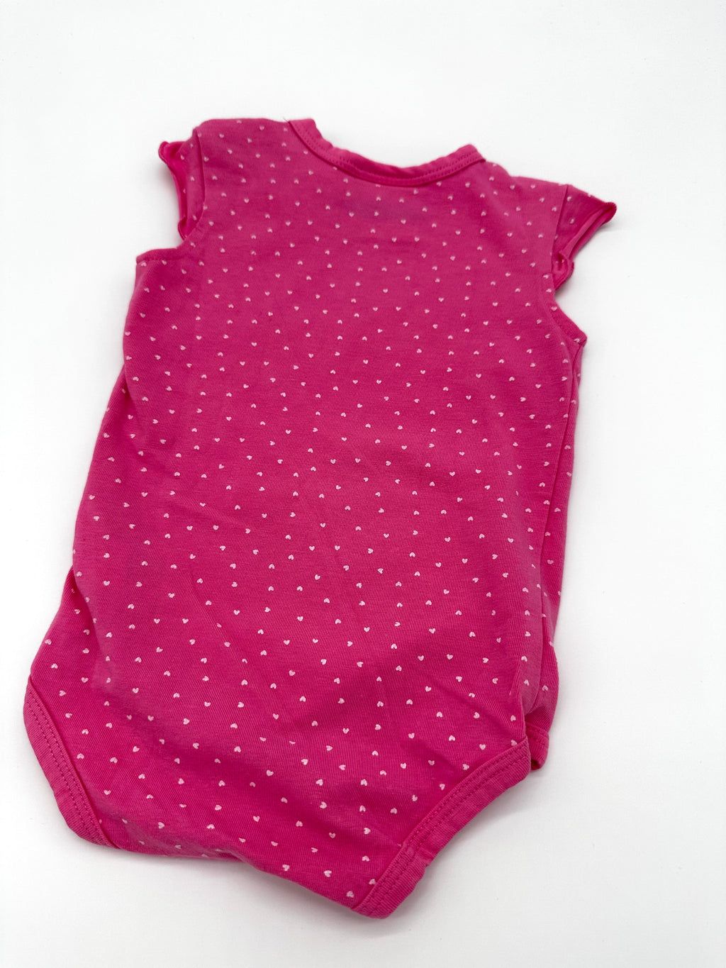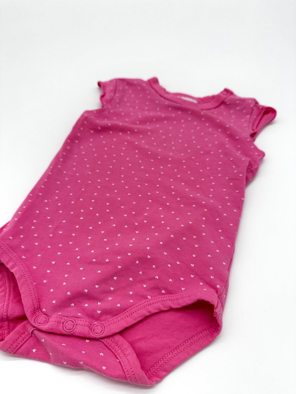 Süßer Kurzarm-Body von Topomini in kräftigem Pink mit zartem weißen Herzchenmuster. Ein echter Hingucker, der gleichzeitig bequem und praktisch ist. Die kleinen Flügelärmel geben dem Body einen besonders niedlichen Look.