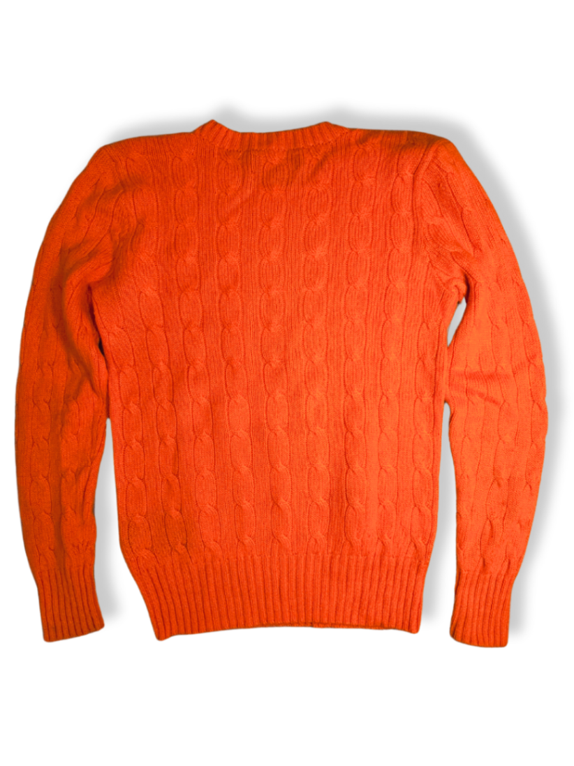 POLO RALPH LAUREN - Ein kräftiger, orangefarbener Pullover von Polo Ralph Lauren setzt ein deutliches Fashion-Statement. Die klassische Zopfstrick-Optik verleiht dem Baumwollmaterial eine edle Note. Perfekt für einen legeren, aber dennoch stilvollen Look. Der Pullover bietet eine ausgezeichnete Wärme und Bequemlichkeit. Kombiniere ihn mit Jeans oder Chinos für ein entspanntes Herbst-Outfit. Die Qualität von Ralph Lauren garantiert eine lange Lebensdauer. Ein Muss für jeden modischen Kleiderschrank. NP. 349€
