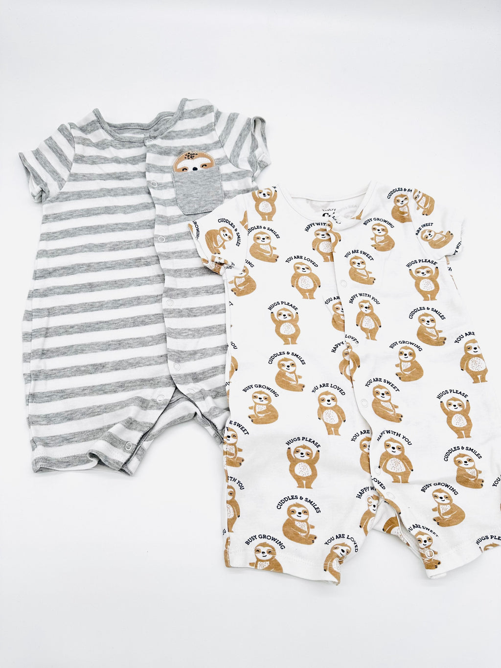 - Ein Strampler gestreift, einer mit Faultier-Motiv