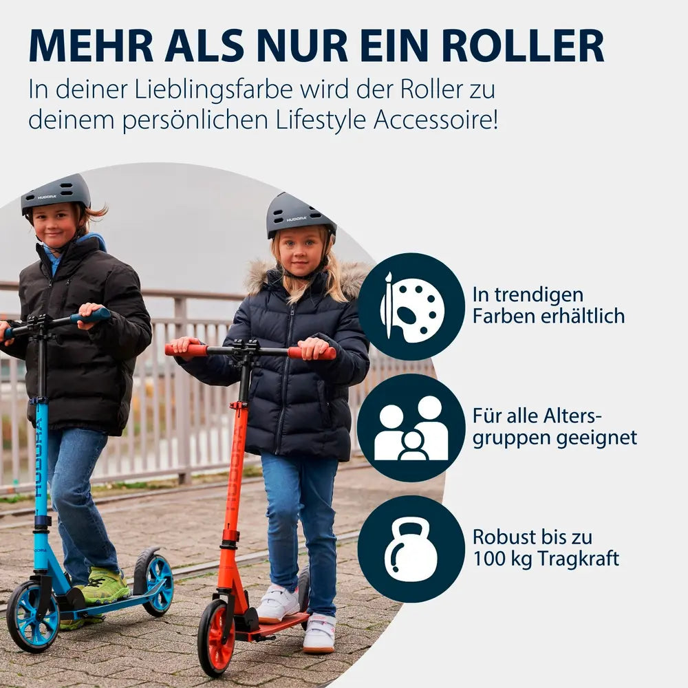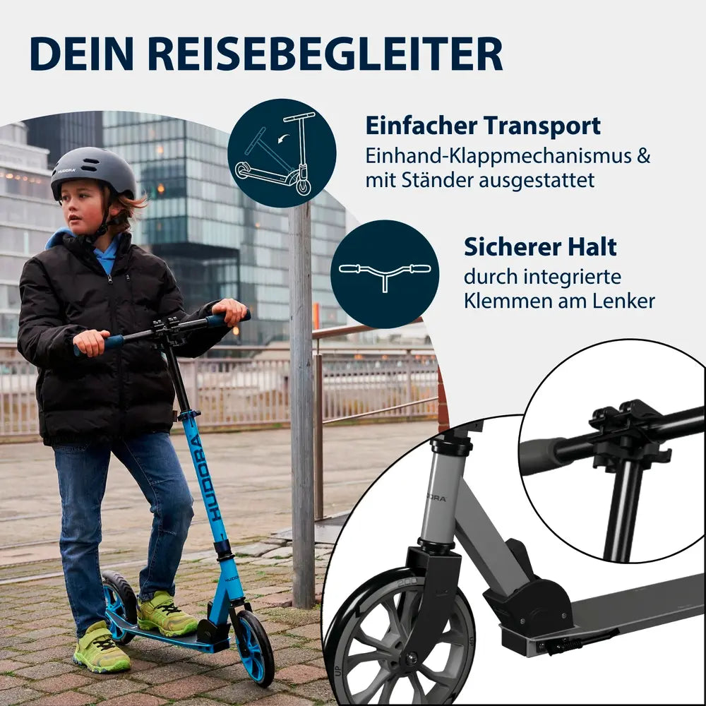 Dieser Scooter besteht aus hochwertigem Aluminium und verfügt über eine stabile Hinterradreibungsbremse aus Stahl. Die schwarz gepulverte Lenkstange ist höhenverstellbar von 60 bis 72 cm und sorgt zusammen mit abnehmbaren TPE-Griffen und eloxierten Klemmen für Komfort und Langlebigkeit. Das Trittbrett misst ca. 50 x 11 cm, die Rollen sind 145 mm Ø und 26 mm breit aus gegossenem PU mit ABEC 5 Kugellagern für eine ruhige Fahrt. Der Scooter ist bis 60 kg belastbar, bietet reflektierende Reifenprints und einen ausklappbaren Ständer.