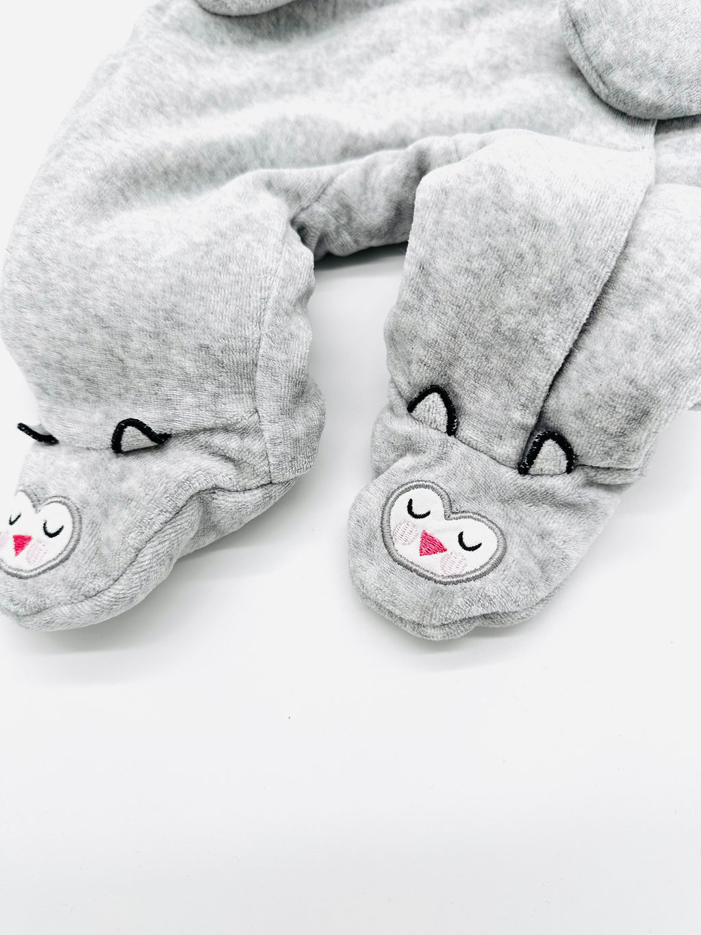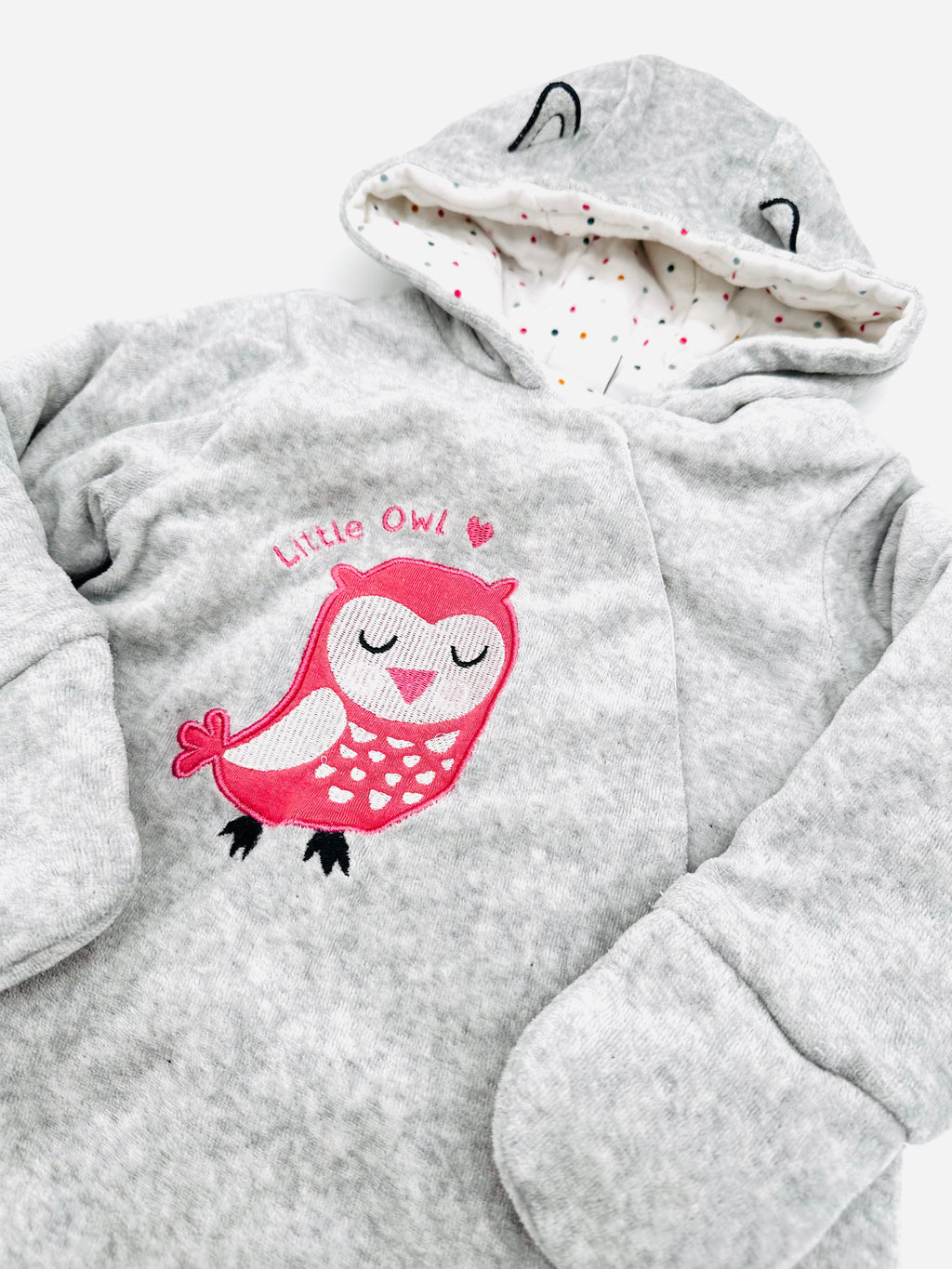 Kuschelweicher Baby-Overall von Manguun in zartem Grau mit liebevollem Eulen-Motiv auf der Vorderseite. Der Overall ist ideal für kühlere Tage, Spaziergänge im Kinderwagen oder gemütliche Stunden zuhause.