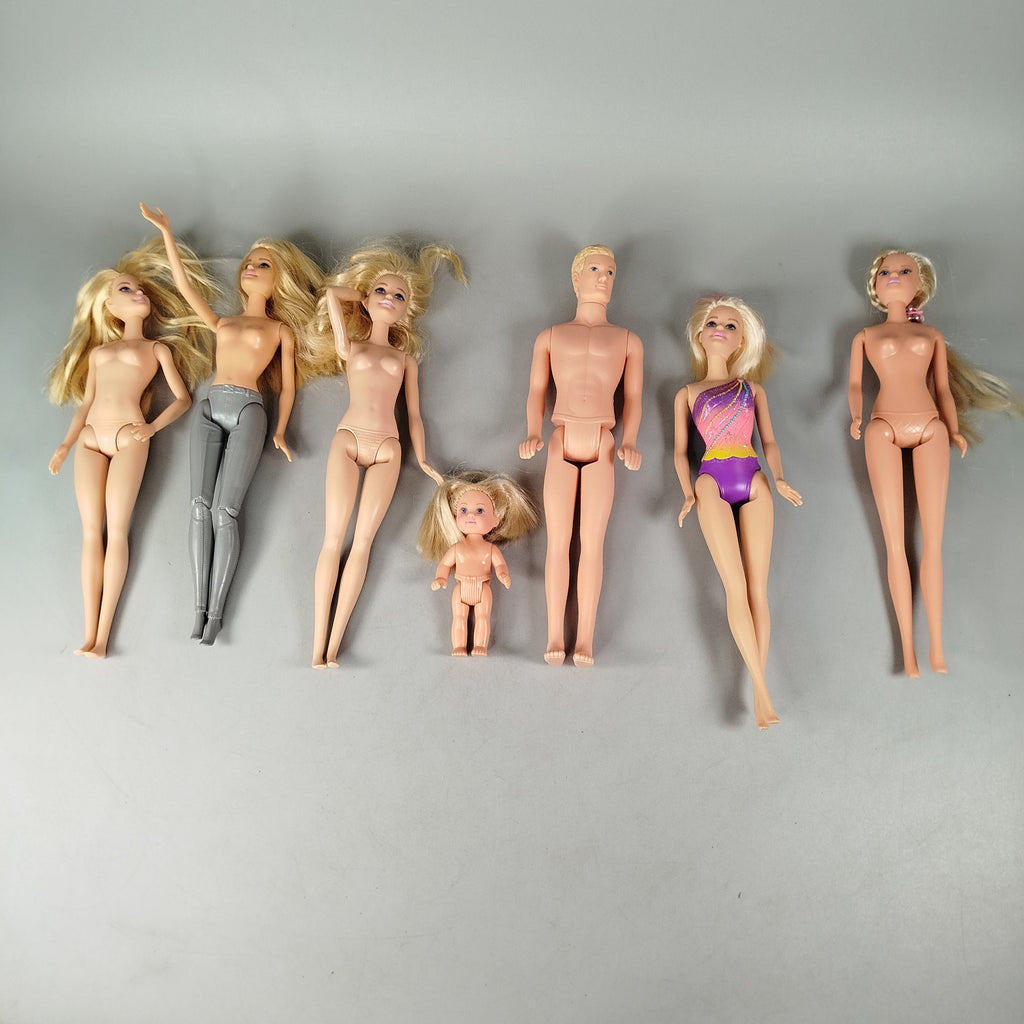 Hol dir das Barbie Puppen-Set mit sieben beweglichen Puppen, einem Kind-Püppchen und einem Pferd mit rosa Sattel. Zwei Barbie-Taschen mit Zubehör und Kleidung sowie weiteres Spielzubehör sind enthalten. Alle Teile sind unboxed und zeigen nur geringe Gebrauchsspuren. Das Set befindet sich in einem sehr guten gebrauchten Zustand. Gib diesem Spielzeug ein neues Zuhause und schenke ihm ein zweites Leben. Hinweis: Nicht für Kinder unter 3 Jahren geeignet, da Kleinteile verschluckt werden können.
