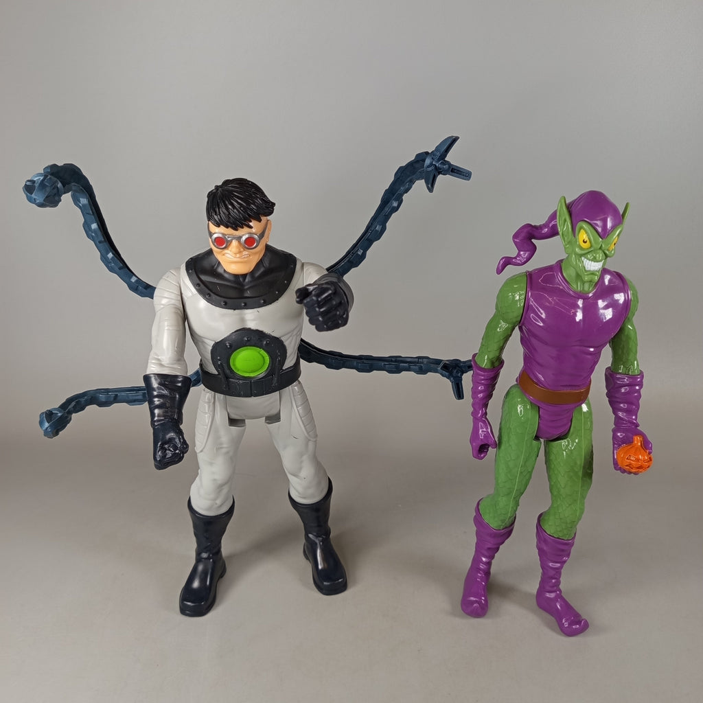 Hol dir die Hasbro Actionfiguren Doctor Octopus und Green Goblin aus dem Marvel-Universum. Doctor Octopus kommt mit vier mechanischen Armen und einem markanten grünen Brustteil, während Green Goblin eine orangefarbene Kürbisbombe in der Hand hält. Beide Figuren sind unboxed und zeigen leichte Gebrauchsspuren. Gib diesen tollen Sammlerfiguren ein neues Zuhause und erweitere deine Marvel-Sammlung. Die Vollständigkeit konnte nicht überprüft werden.