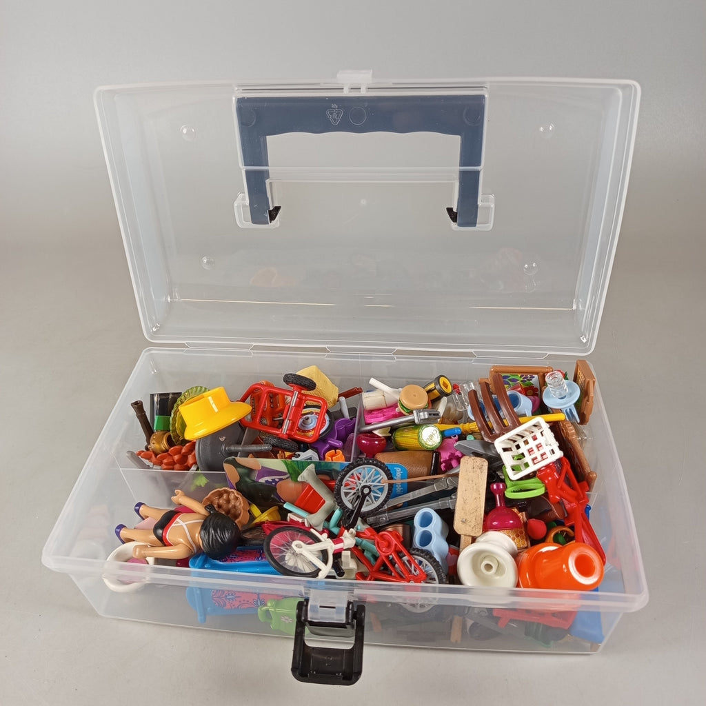 Hol dir das Playmobil Set voller Figuren und Zubehör für kreative Rollenspiele! Enthalten sind verschiedene Teile wie Figuren, Fahrräder, Gartenwerkzeuge, Sitzmöbel und Körbe, alle lose in einer durchsichtigen Aufbewahrungsbox. Gib diesen Playmobil Teilen ein neues Zuhause und fördere fantasievolles Spielen. Das Set befindet sich in einem sehr guten gebrauchten Zustand. Hinweis: Enthält Kleinteile, nicht geeignet für Kinder unter 3 Jahren.