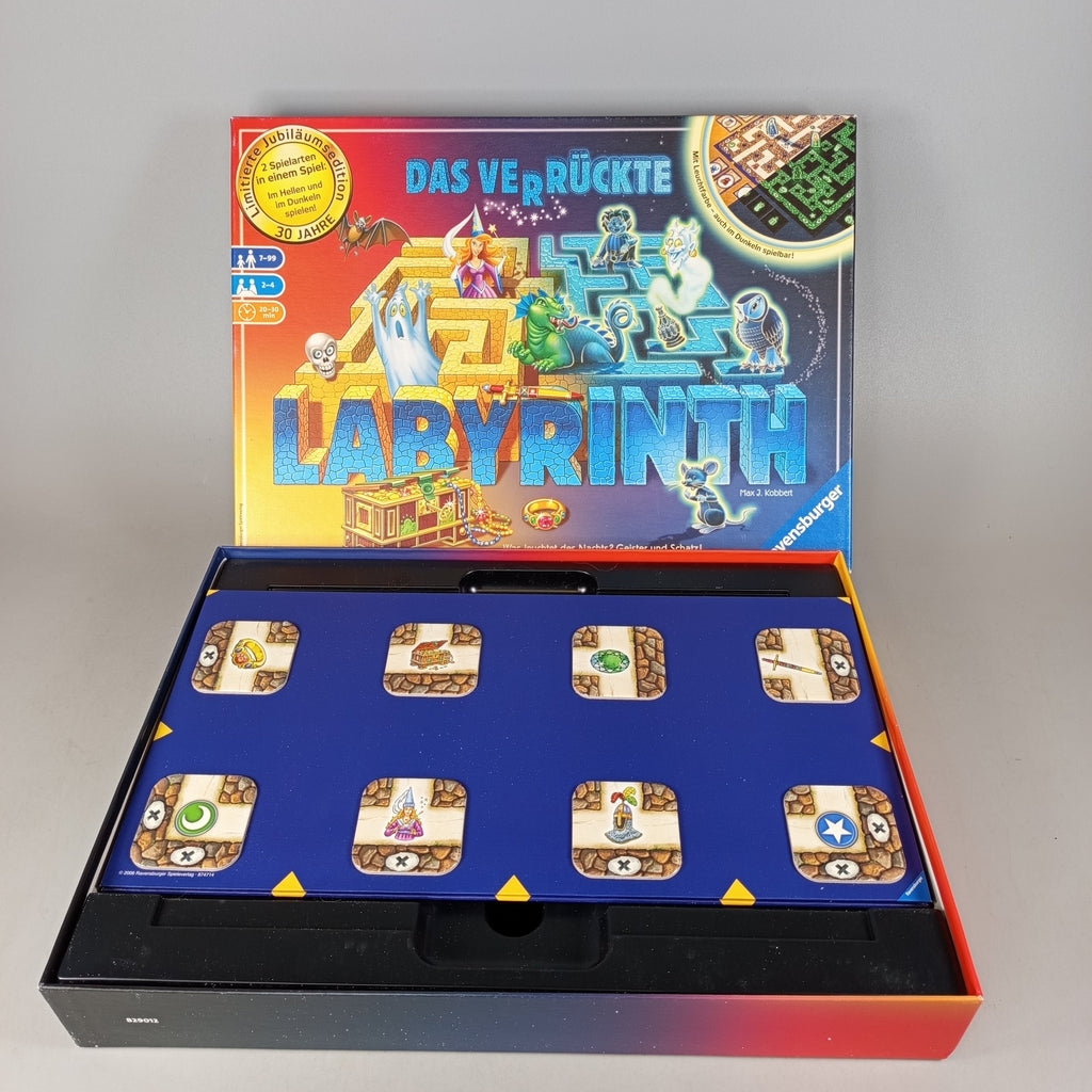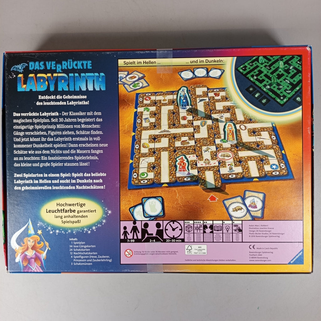 Hol dir das Brettspiel Das verrückte Labyrinth von Ravensburger und tauche in ein verschiebbares Labyrinth voller Schätze ein. Die limitierte Jubiläumsedition mit Leuchtfarbe lässt sich im Hellen und im Dunkeln spielen und sorgt für spannende Partien für 2–4 Spieler. Enthalten sind Spielplan, Karten, Spielfiguren und Spielmaterial für taktisches Schieben und Finden. Gib diesem Spiel ein neues Zuhause und verlängere seinen Spielspaß. Empfohlen ab 7 Jahren. Hinweis gemäß GPSR: Enthält Kleinteile, nicht geeignet für Kinder unter 3 Jahren.
