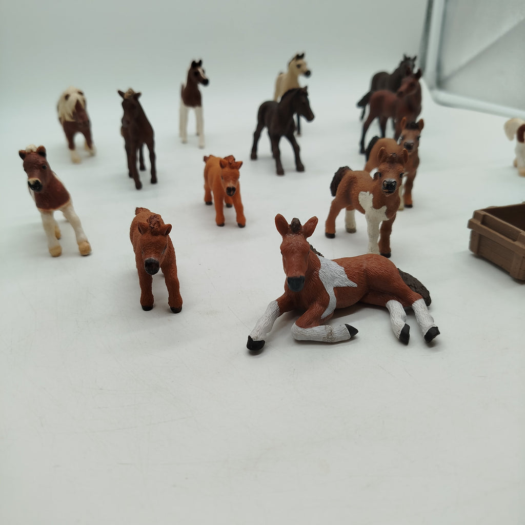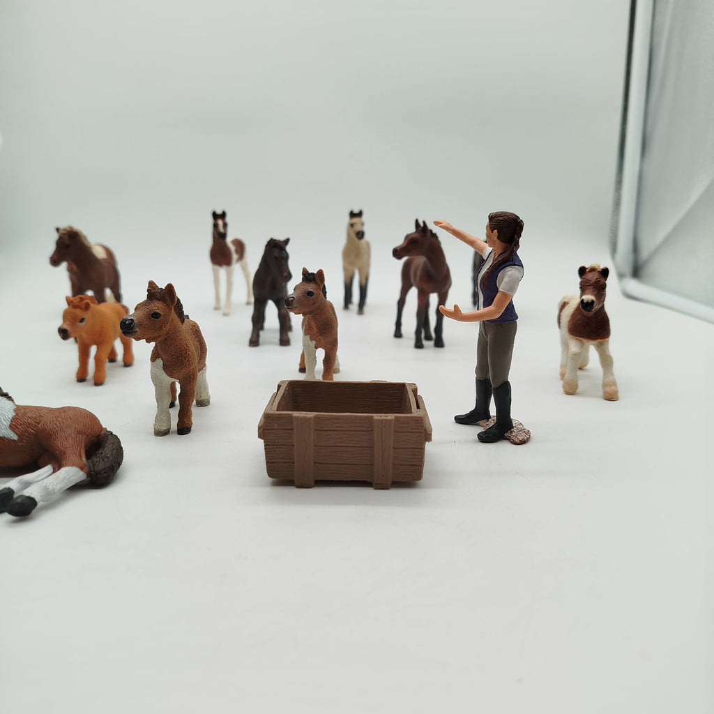 Hol dir das Schleich Figuren-Set für echte Pferdefans! Dieses Set enthält 14 detailgetreue Fohlenfiguren, eine Menschenfigur und eine rechteckige Kiste aus robustem Kunststoff. Perfekt für fantasievolle Rollenspiele rund um den Pferdehof. Das Spielzeug befindet sich in einem sehr guten gebrauchten Zustand. Gib diesen liebenswerten Figuren ein zweites Zuhause und fördere kreatives Spielen. Verpackung fehlt. Sicherheitshinweis: Nicht für Kinder unter 3 Jahren geeignet, da Kleinteile verschluckt werden können.